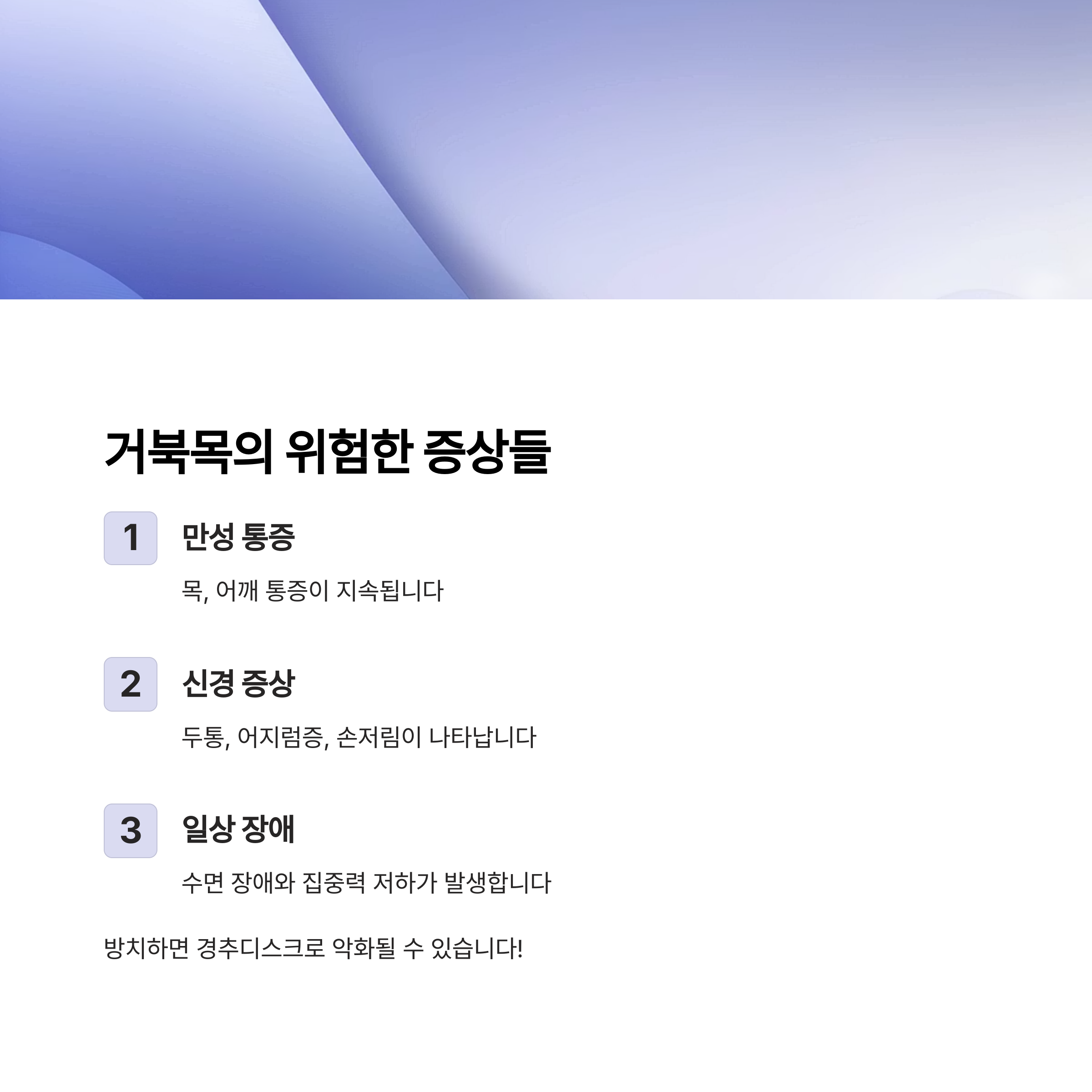 심하면 경추디스크로 이어질 수 있어 주의가 필요합니다.