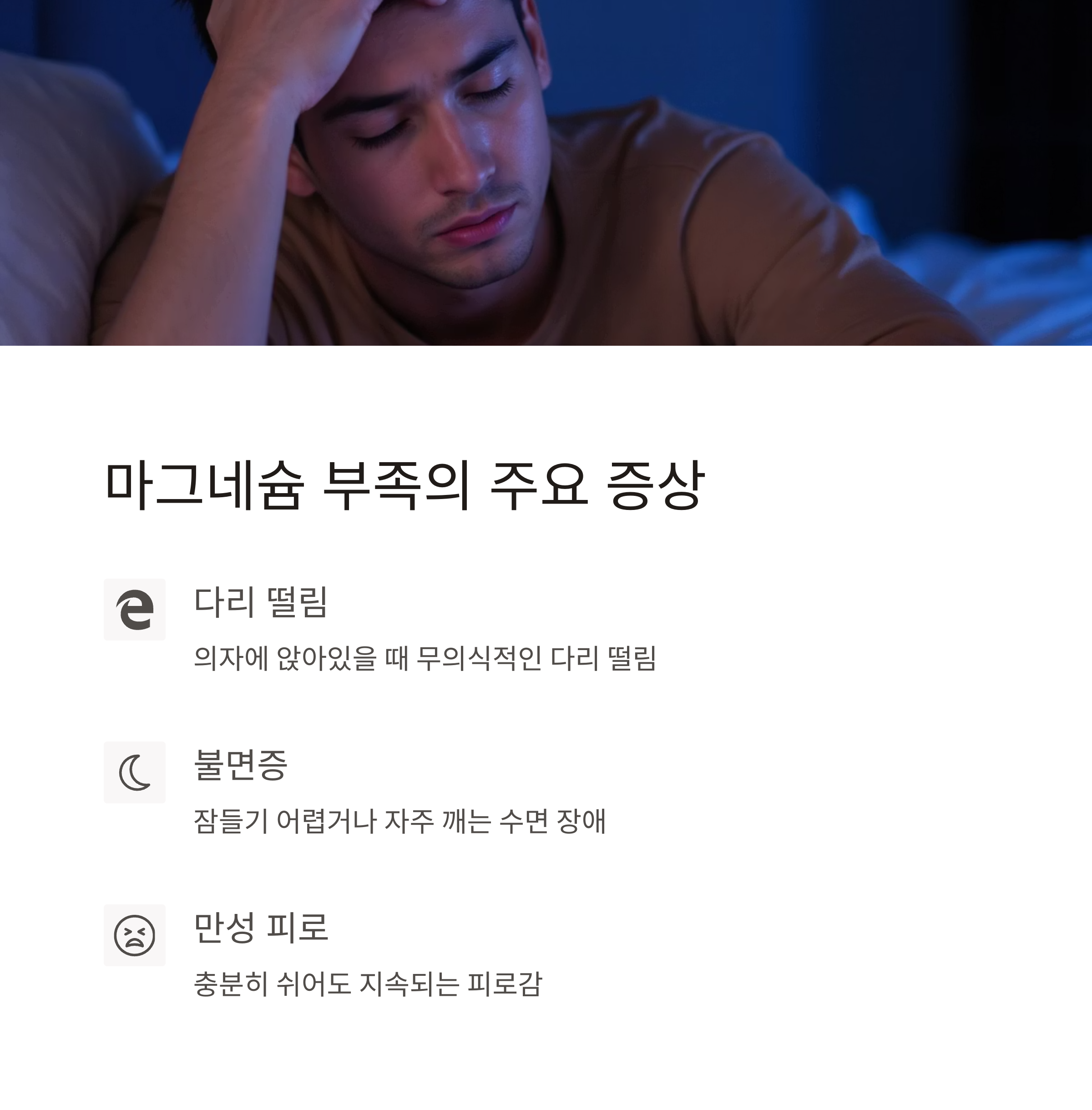 불면, 커피 과다, 스트레스, 다리 경련 등 3개 이상 해당 시 결핍 의심.