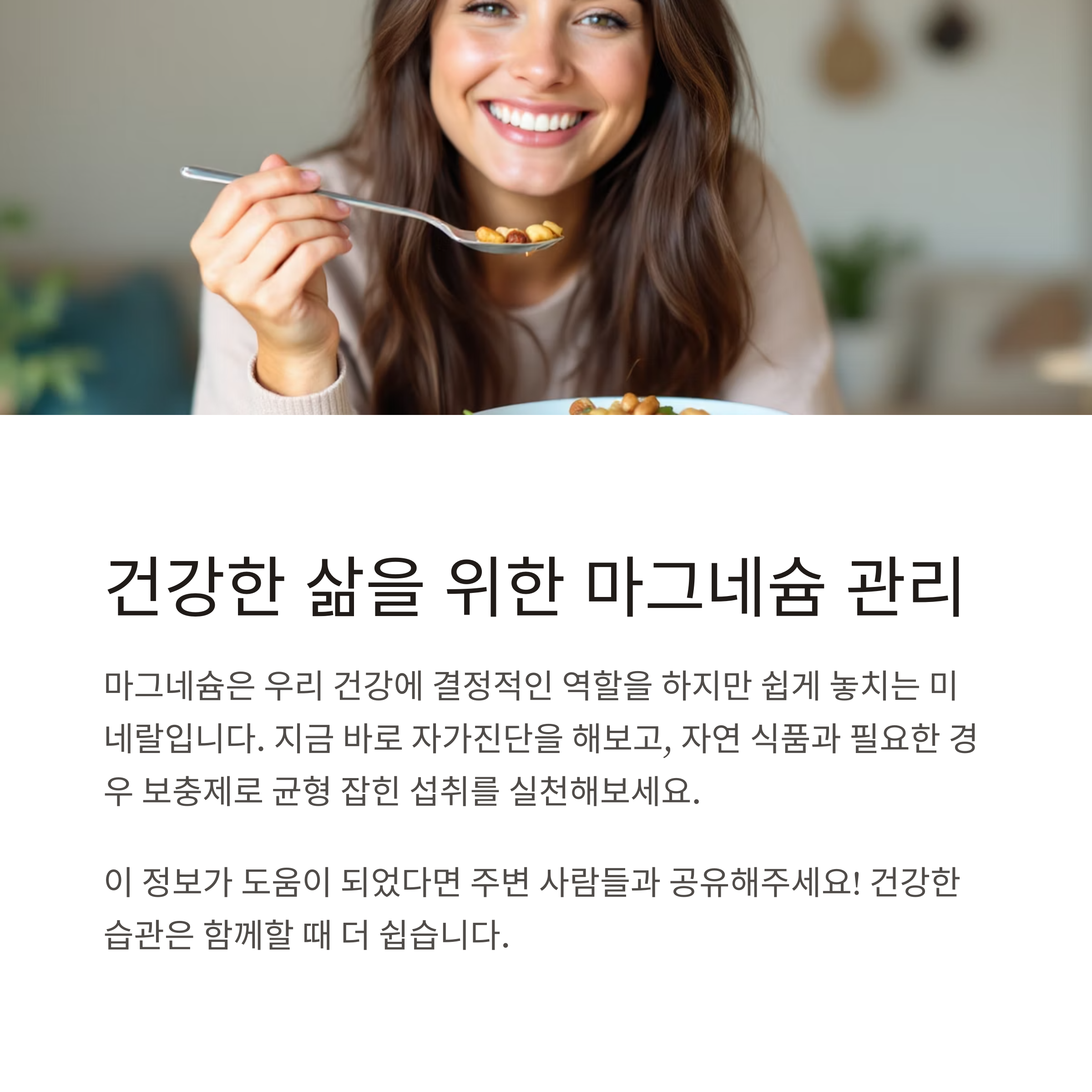 오늘 알아본 마그네슘은 우리가 생각보다 더 자주, 그리고 많이 부족해질 수 있는 중요한 미네랄입니다. 평소 피곤하거나 다리에 경련이 자주 생기고, 수면의 질이 떨어진다면 단순한 피로나 스트레스 때문이 아닐 수 있어요. 간단한 자가진단으로 본인의 상태를 점검해보시고, 음식과 보충제를 통해 보다 건강한 라이프스타일을 실천해보시길 바랍니다. 작은 변화가 큰 건강의 차이를 만들어줍니다. 오늘도 당신의 건강을 진심으로 응원합니다.