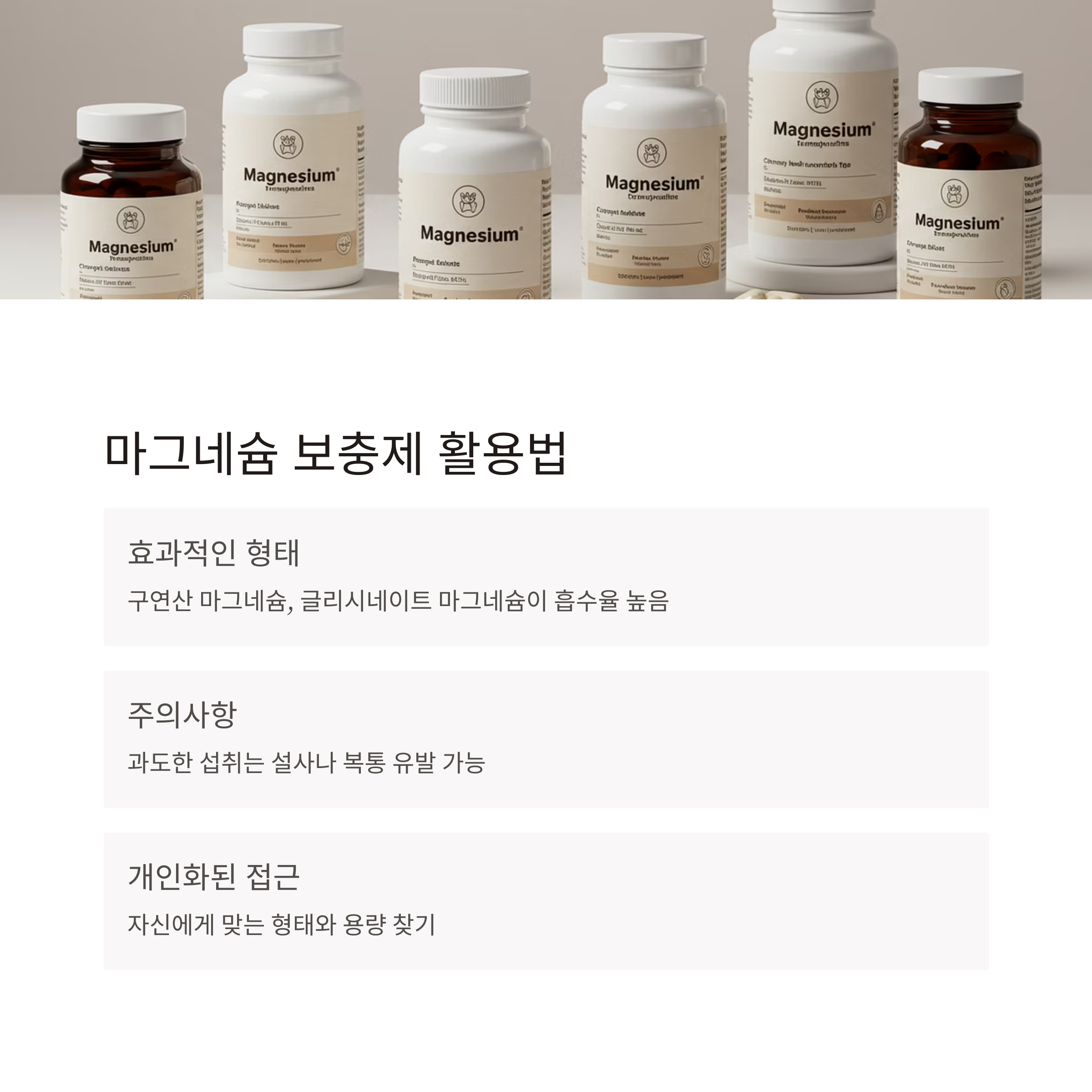 하지만 음식만으로 충분하지 않은 경우도 많습니다. 이럴 땐 마그네슘 보충제를 활용할 수 있습니다. 최근에는 흡수율이 높은 구연산 마그네슘, 글리시네이트 마그네슘 제품이 시장에서 인기를 끌고 있습니다. 다만 과도한 섭취는 설사나 복통을 유발할 수 있으므로 자신에게 맞는 형태와 용량을 찾는 것이 중요합니다.