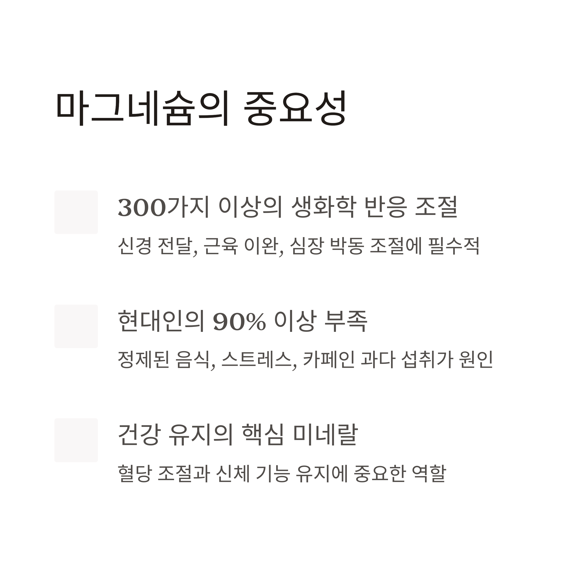 300가지 생화학 반응에 필수이며 신경과 근육에 중요한 미네랄입니다.
