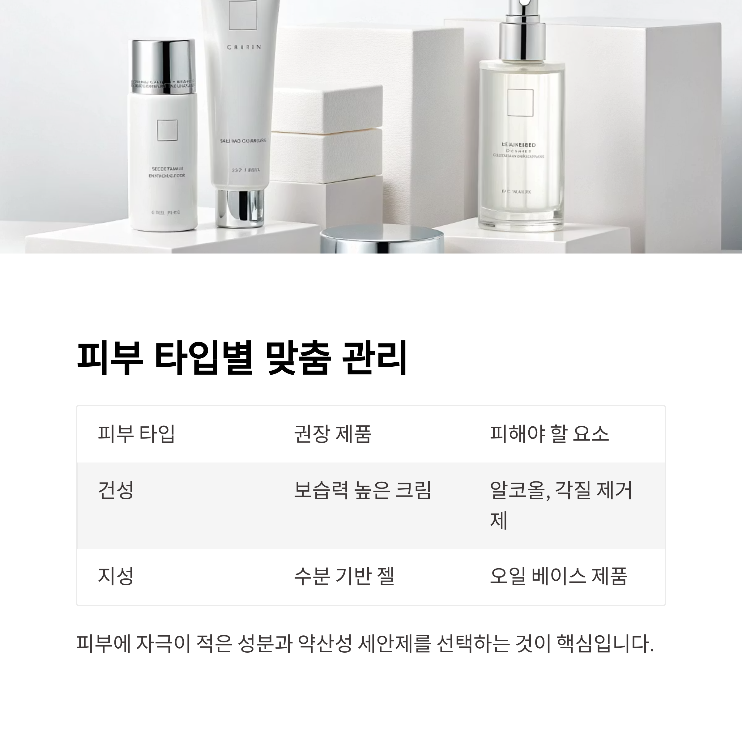 | 건성 | 보습력 높은 크림 | 알코올, 각질 제거제 |