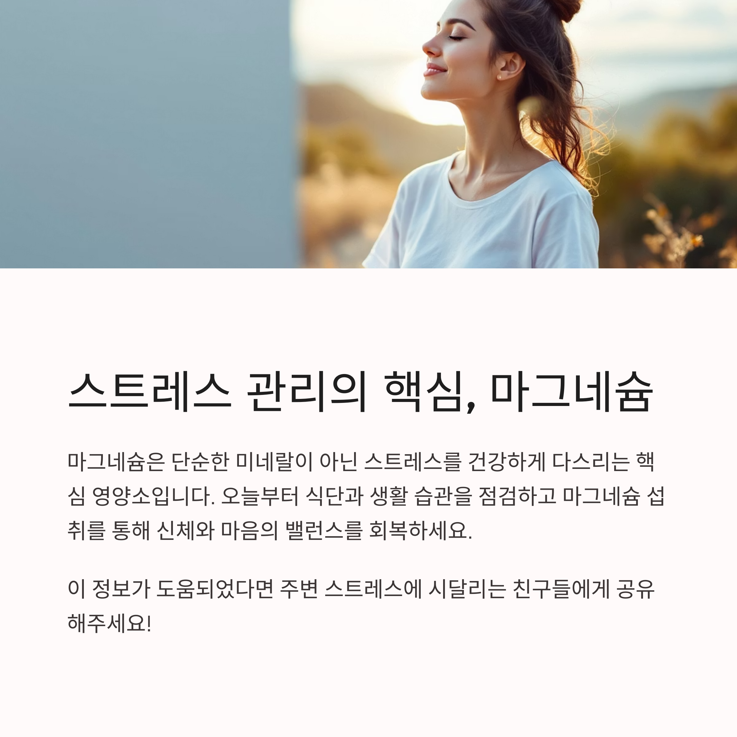 마그네슘은 우리가 스트레스를 건강하게 다스릴 수 있도록 돕는 핵심 영양소입니다. 바쁜 일상 속에서 스트레스가 일상이 된 현대인에게 마그네슘 부족은 결코 가볍게 넘길 수 없는 문제입니다. 오늘부터 식단과 생활 습관을 점검하고, 마그네슘 섭취를 통해 신체와 마음의 밸런스를 회복해보세요. 지금 내 몸 상태를 체크해보고, 건강한 스트레스 관리 루틴을 시작해보는 건 어떨까요? 다음 글에서는 마그네슘이 풍부한 식단 가이드를 소개해드릴게요. 기대해주세요!