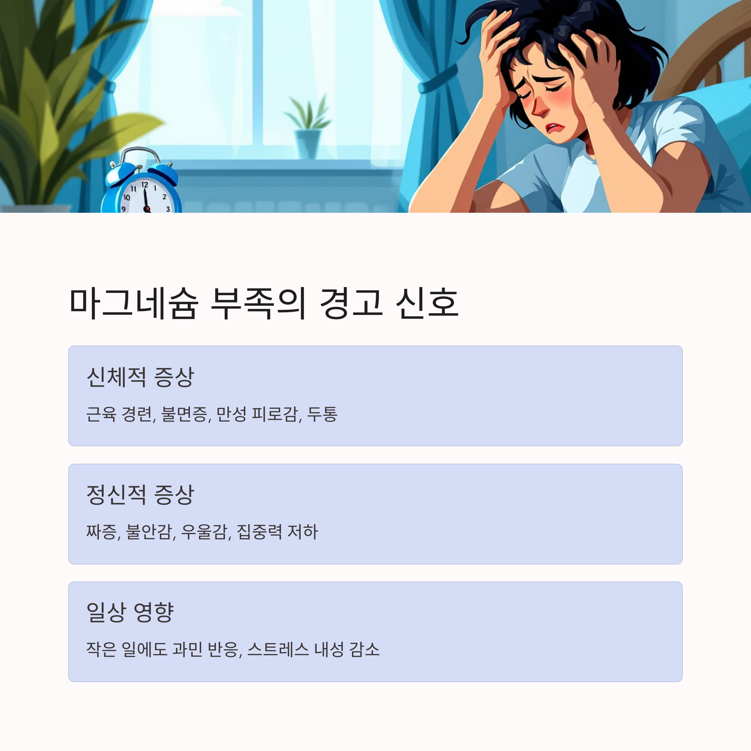 근육 경련, 피로, 정서 불안 등 증상이 동반됩니다.