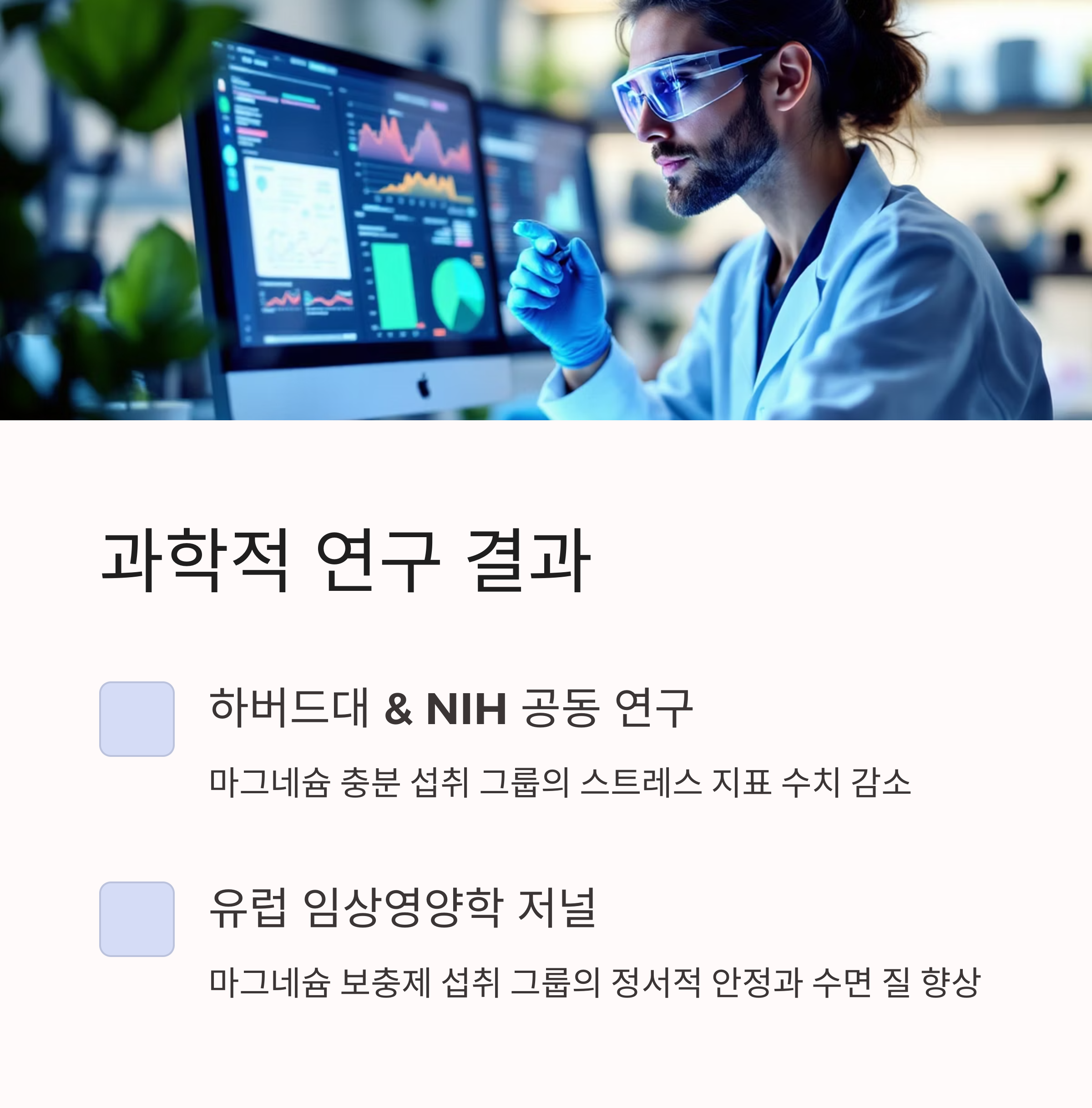 하버드대 공공보건대학원과 NIH 공동 연구에 따르면, 마그네슘을 충분히 섭취한 그룹은 스트레스 지표 수치가 낮게 나타났습니다. 또한 유럽 임상영양학 저널에 실린 한 연구에서는 마그네슘 보충제를 섭취한 피실험자 그룹이 정서적 안정과 수면의 질에서 유의미한 향상을 보였습니다. 이러한 연구들은 마그네슘의 실제 효과를 과학적으로 뒷받침하고 있습니다.