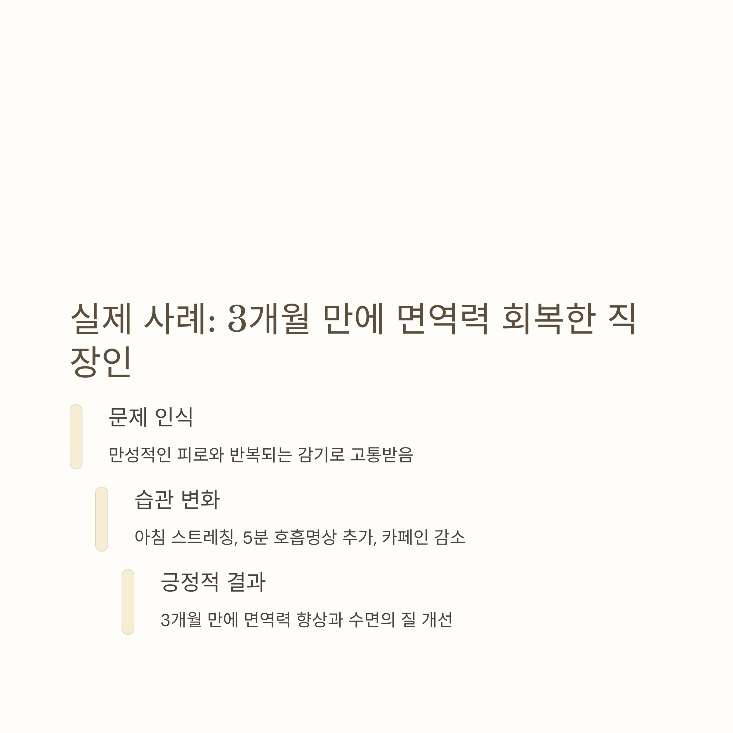 | 장기간 고수준은 면역력 저하로 이어질 수 있습니다 | 감기, 피부질환, 염증 증가와 연관됩니다 | 꾸준한 실천이 면역력을 회복시키는 핵심입니다 |
