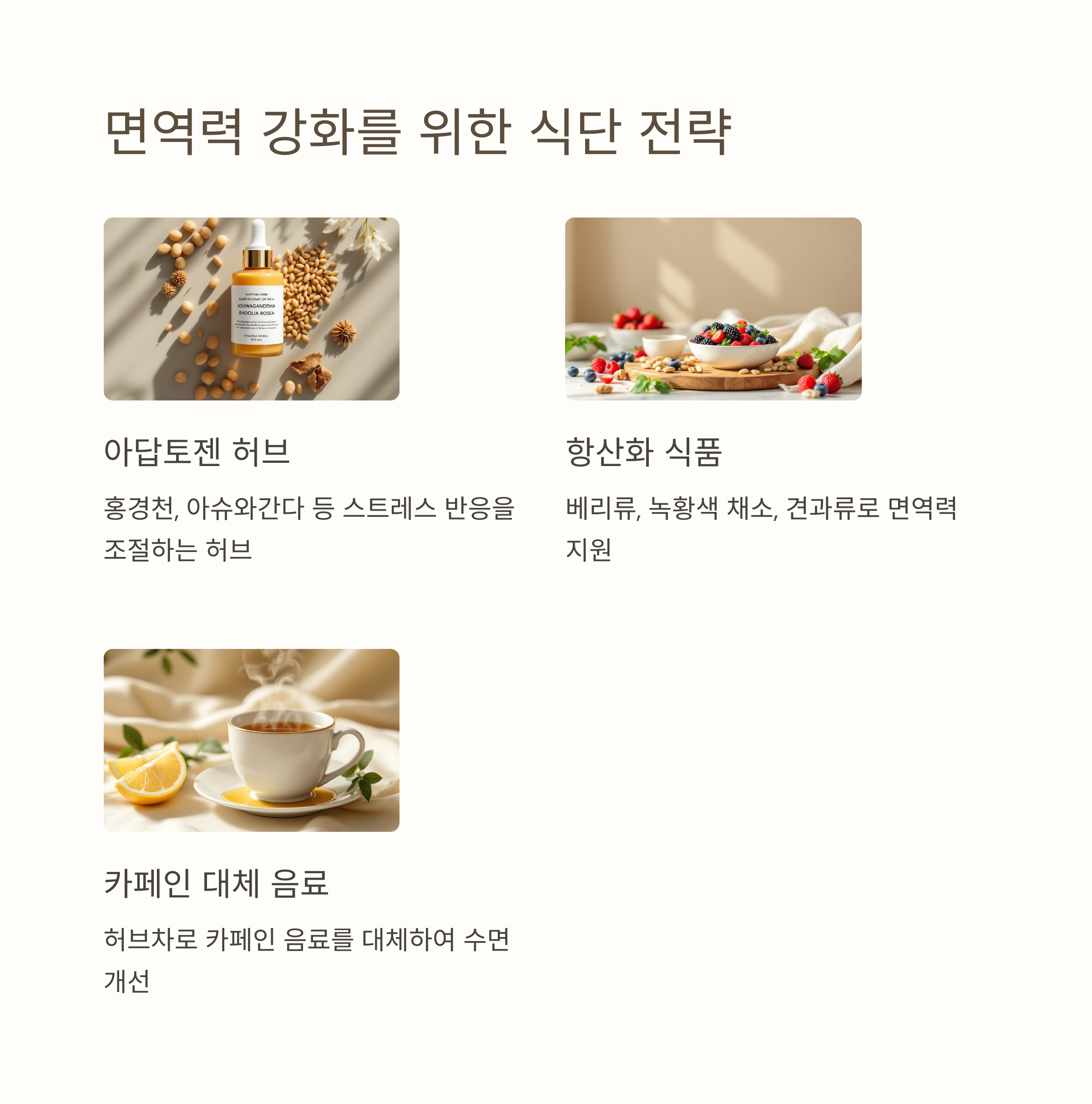 식습관 또한 면역력에 매우 큰 영향을 미칩니다. 항산화 성분이 풍부한 채소와 과일을 꾸준히 섭취하고, 가공식품과 당 섭취를 줄이는 것이 중요합니다. 특히 아답토젠 허브는 스트레스에 적응하고 면역 시스템의 회복을 촉진하는 데 도움이 될 수 있습니다. 충분한 수면과 규칙적인 생활 습관은 기본 중의 기본이며, 이것이 잘 지켜질 때 비로소 면역력은 제 역할을 하게 됩니다.