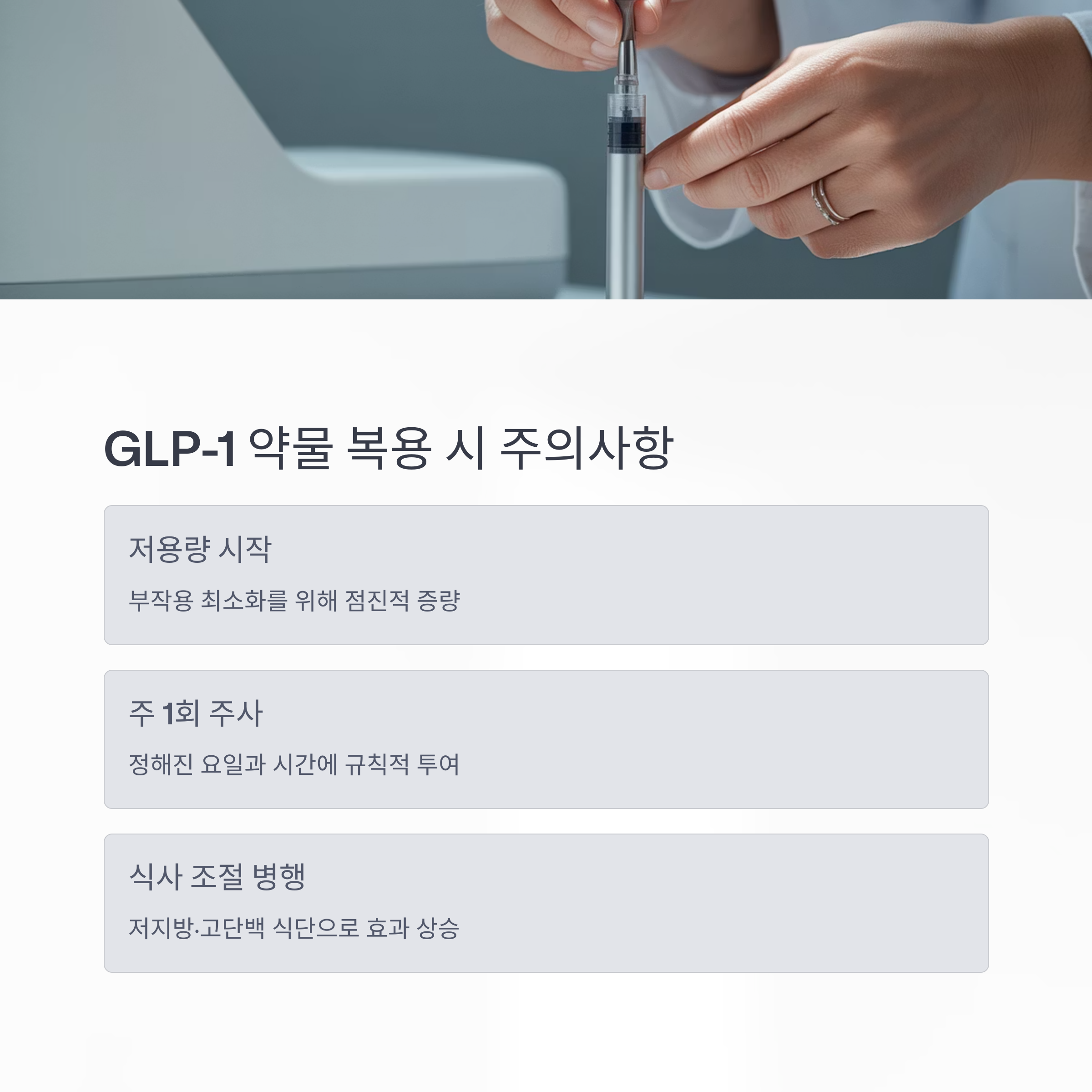 GLP-1 약물은 단번에 고용량으로 시작하면 부작용이 심화될 수 있습니다.