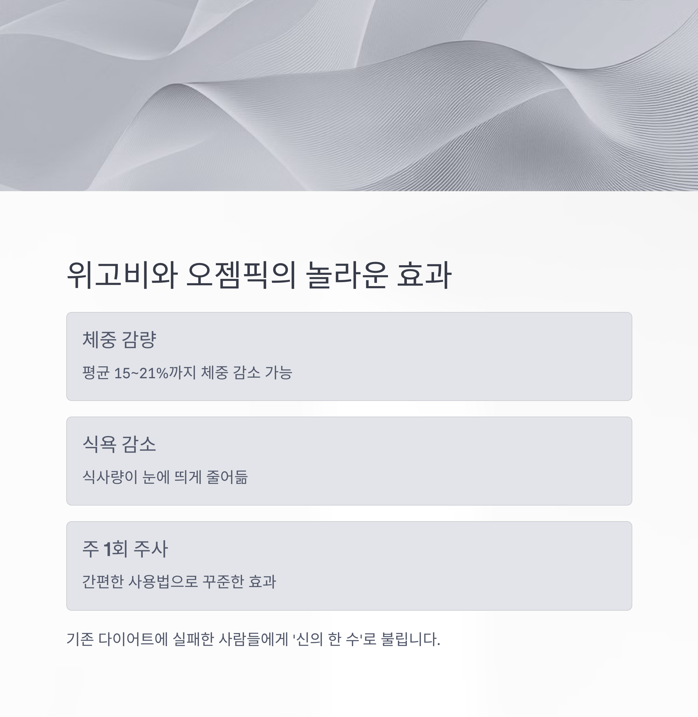 | 주 1회 주사 | 위고비·오젬픽 공통 복용 주기 |