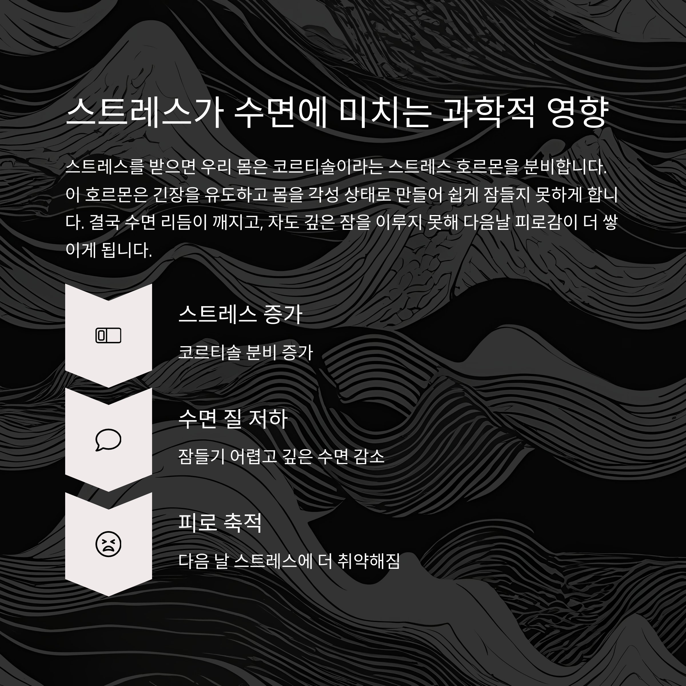 스트레스가 수면에 미치는 영향은 과학적으로 입증되어 있습니다.