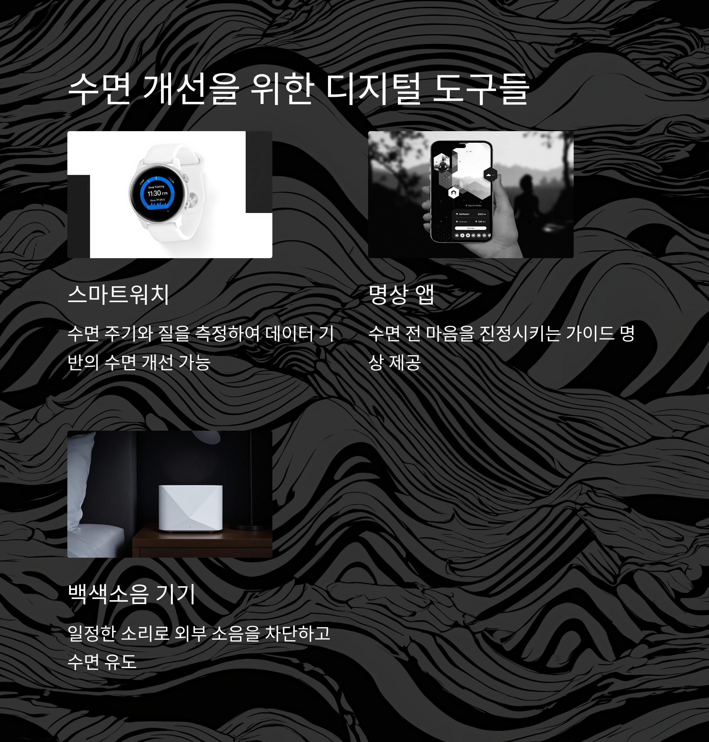 대표적으로는 스마트워치, 명상 앱, ASMR 콘텐츠, 백색소음 기기 등이 있으며