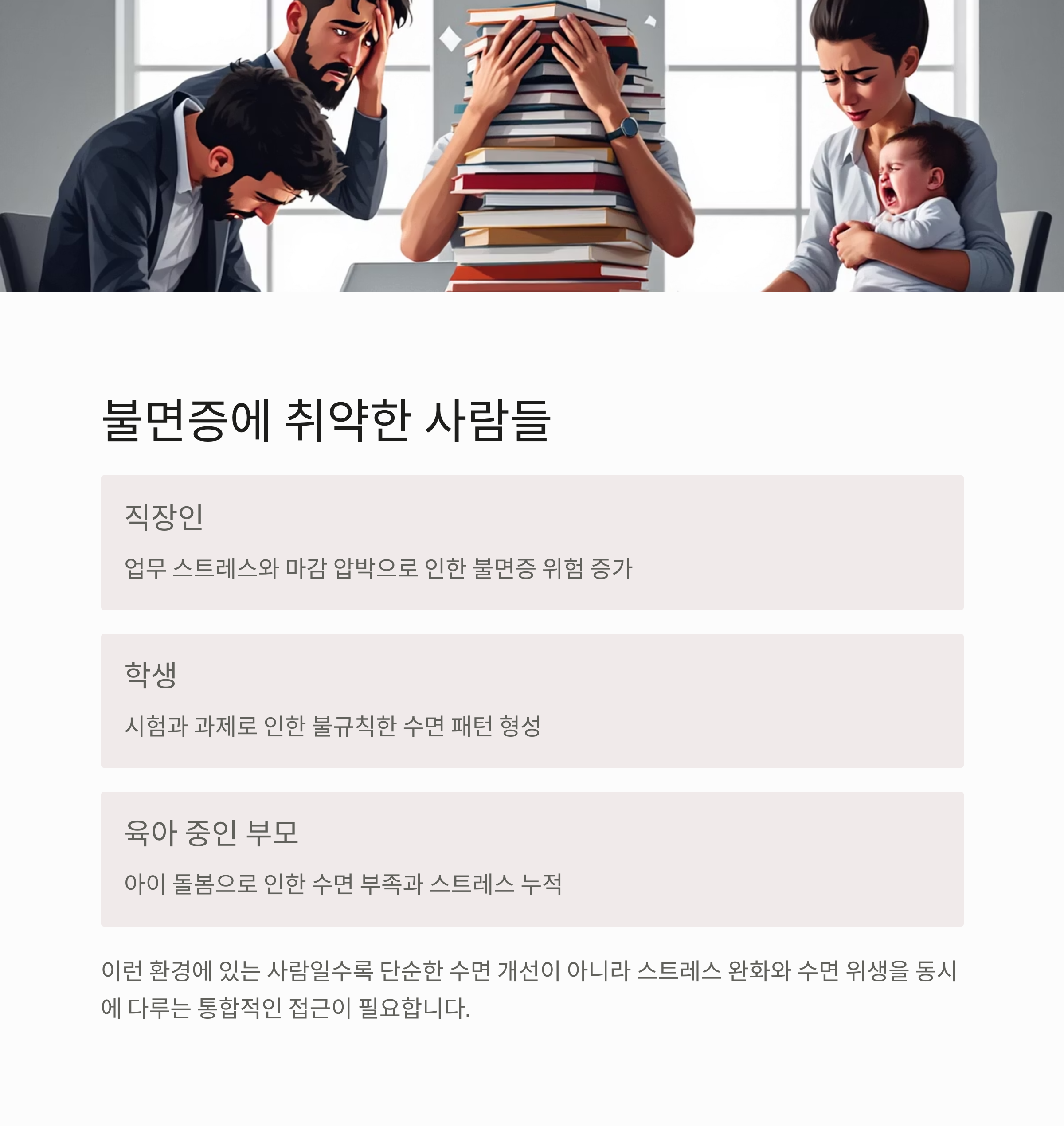 직장인, 학생, 육아 부모 등이 불면증에 더 취약합니다.