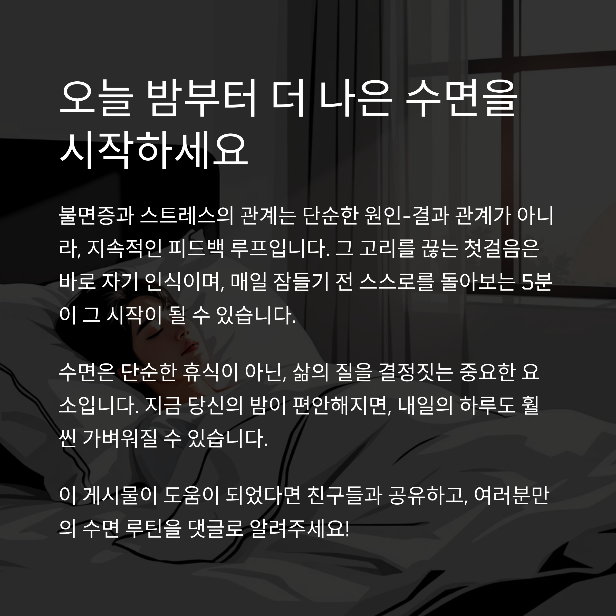 불면증과 스트레스는 우리가 살아가며 마주하는 현실적인 고민이지만, 꾸준한 습관과 자기 인식으로 충분히 극복할 수 있습니다.