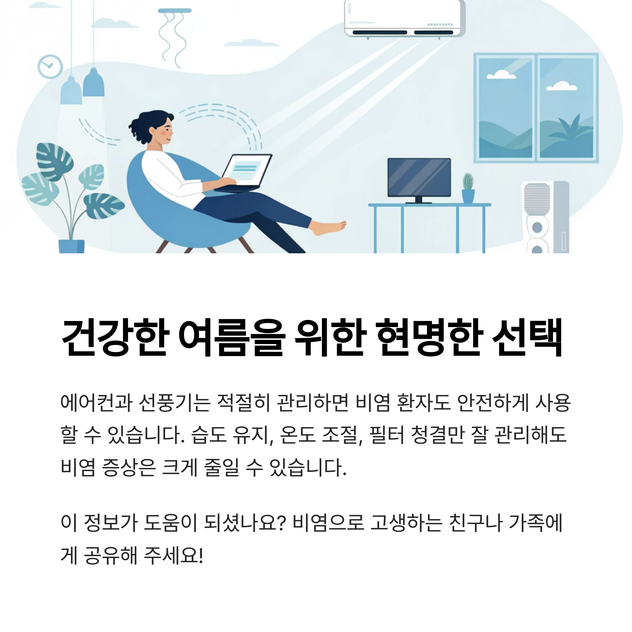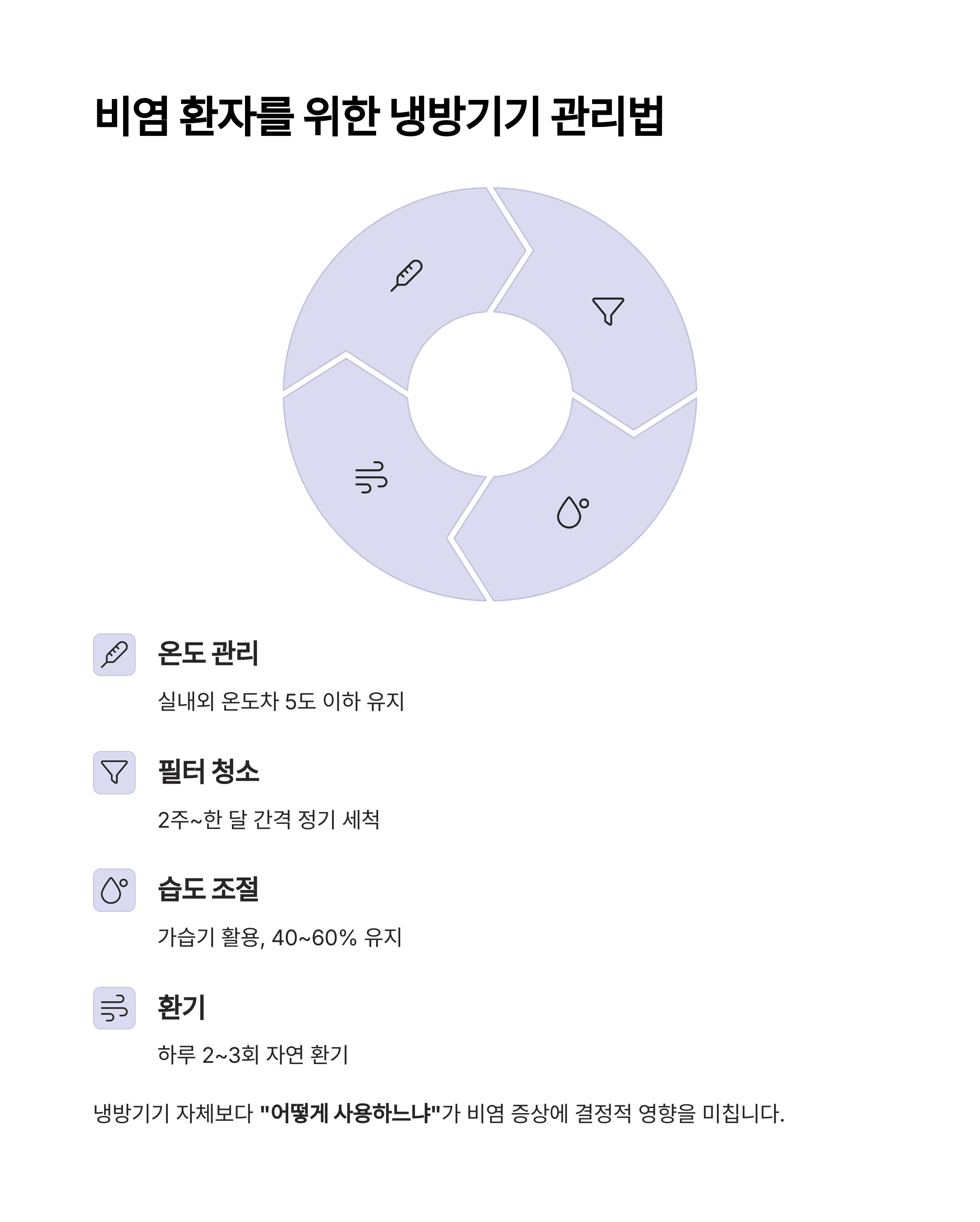 특히 비염 환자는 냉방기기의 사용 습관과 실내 환경 관리에 신경 써야 합니다.