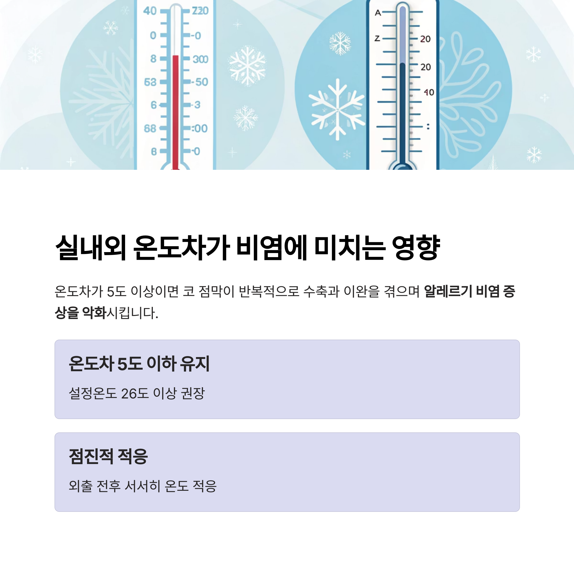 급격한 냉기 노출은 혈관운동성 비염 증상(재채기, 콧물, 코막힘)을 악화시킵니다.