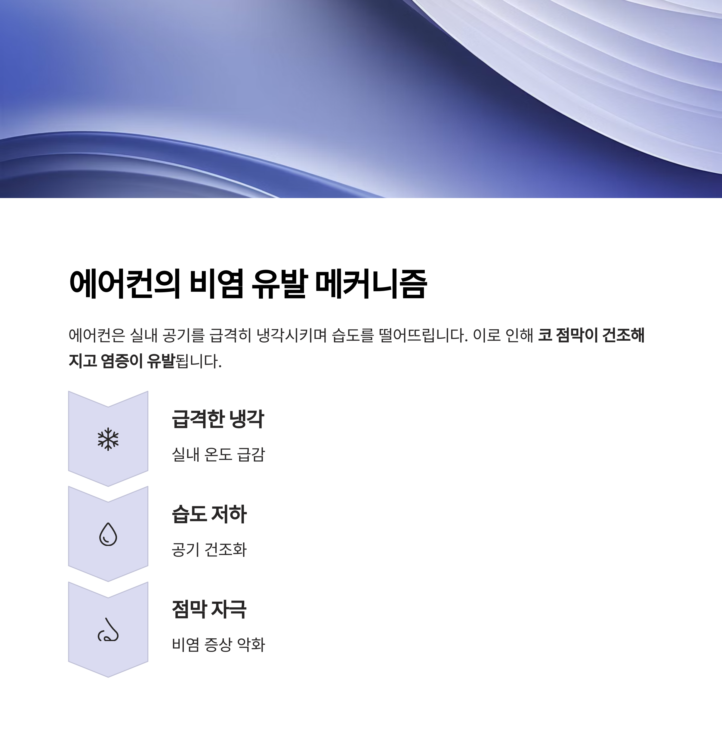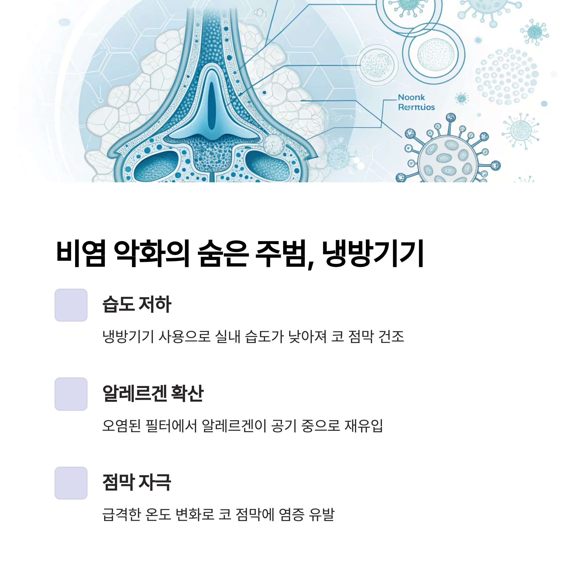 특히 냉방으로 인한 습도 저하, 알레르겐 확산, 점막 자극이 핵심 원인입니다.