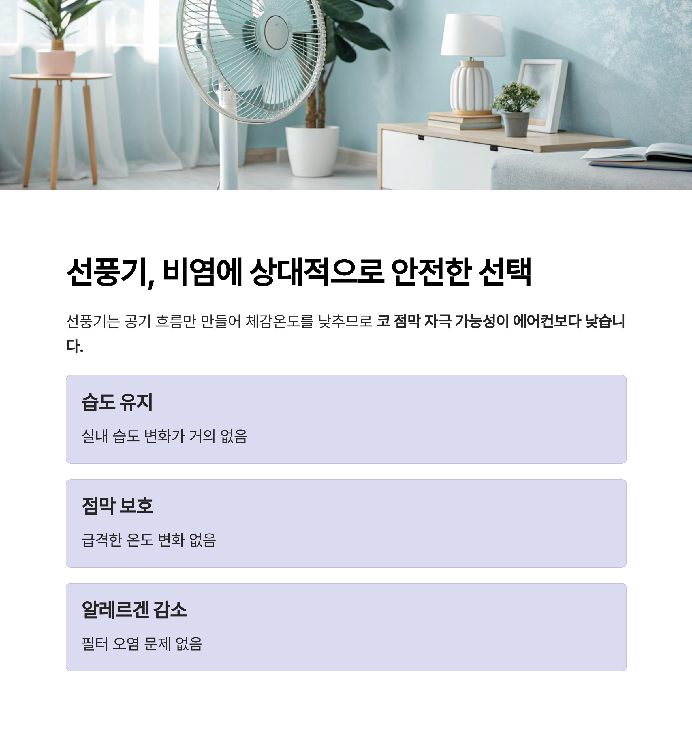| 비염에 대한 영향 | 염증, 건조, 재채기, 콧물 유발 | 비교적 안전하나 장시간 직풍 주의 |