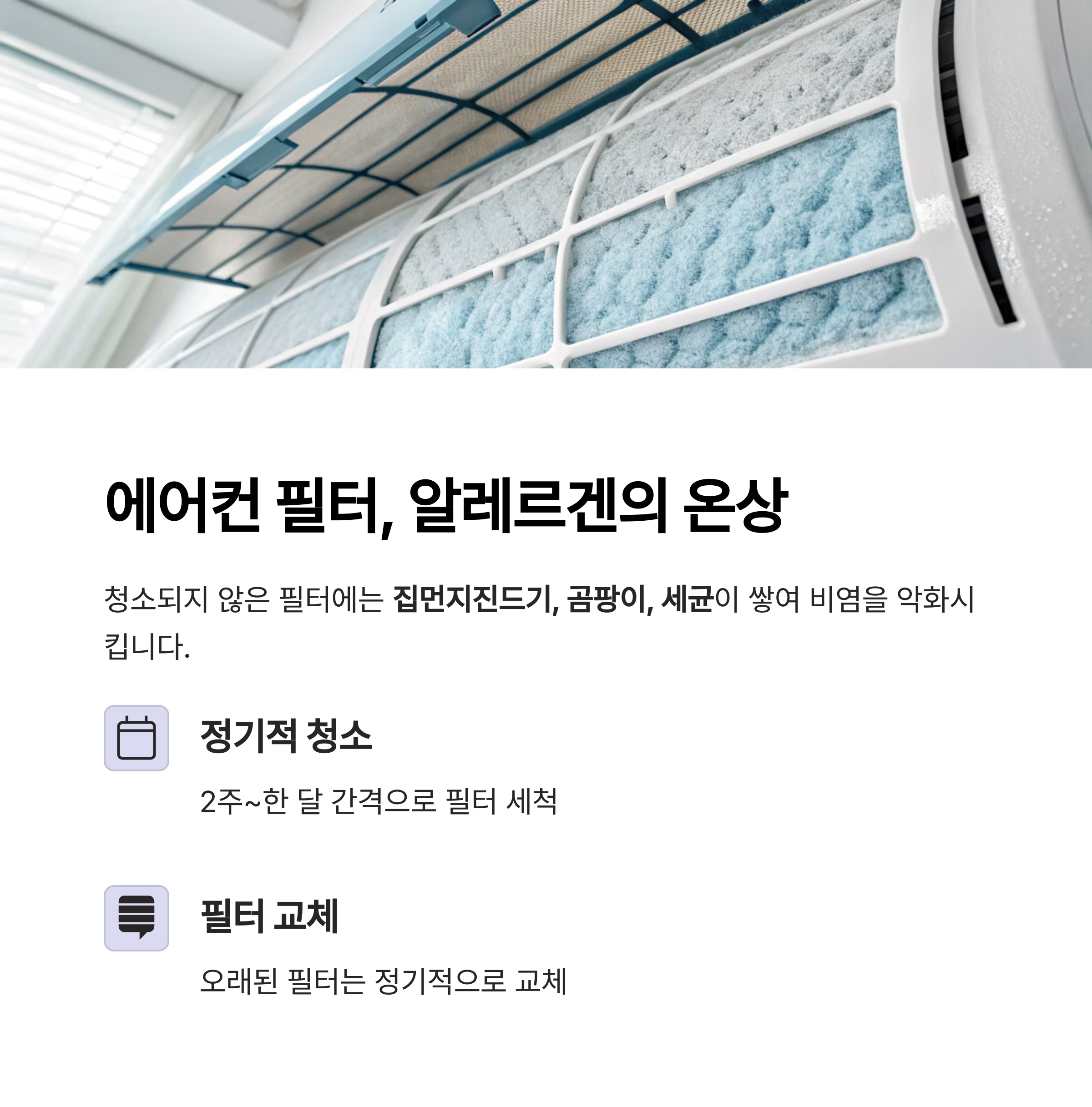 냉방 시 이물질이 공기 중으로 재유입되면 알레르겐 농도가 높아지고,