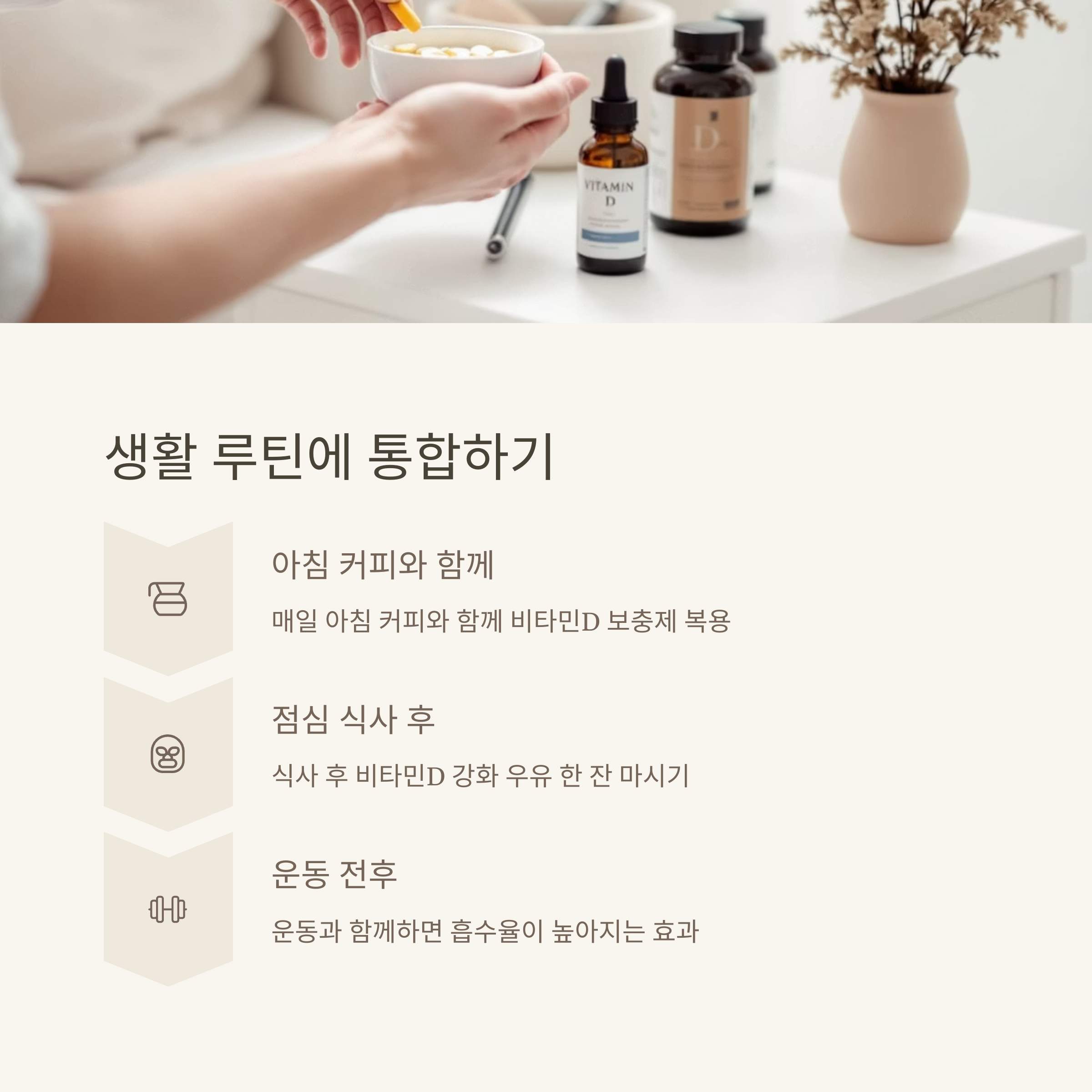 마지막으로, 생활 루틴 속 작은 변화를 통해 자연스럽게 비타민D 섭취를 습관화하는 것이 중요합니다. 예를 들어 아침에 비타민D 보충제를 커피와 함께 복용하거나, 점심 식사 후 강화 우유 한 잔을 마시는 습관만으로도 상당한 도움이 됩니다. 운동 전후로 비타민D를 함께 섭취하면 흡수율도 높아진다는 연구 결과도 참고할 만합니다. 결론적으로 우리는 햇빛 외에도 다양한 방식으로 비타민D를 충분히 공급받을 수 있습니다. 현대적인 생활 방식과 식습관에 맞춘 전략적인 접근이 필요한 시점입니다. 특히 기분 변화나 피로감, 면역력 저하를 느낀다면 단순한 생활 습관 개선보다는 비타민D 보충을 본격적으로 고려해보는 것이 필요합니다. 지금부터라도 자신의 생활 패턴을 점검해보고, 햇빛 없이도 비타민D를 챙길 수 있는 작은 실천을 시작해보세요. 건강을 위한 변화는 아주 사소한 루틴에서부터 시작될 수 있습니다.