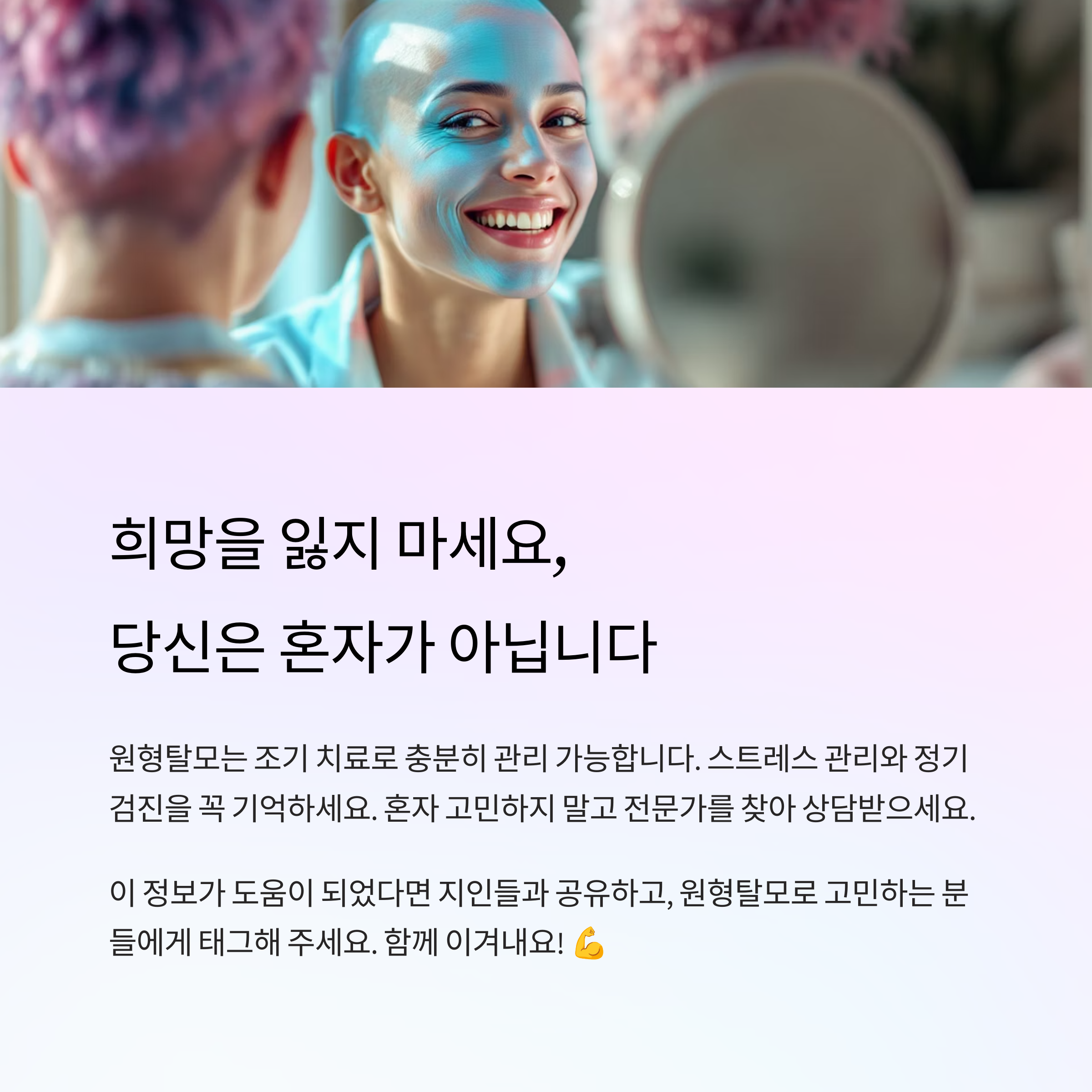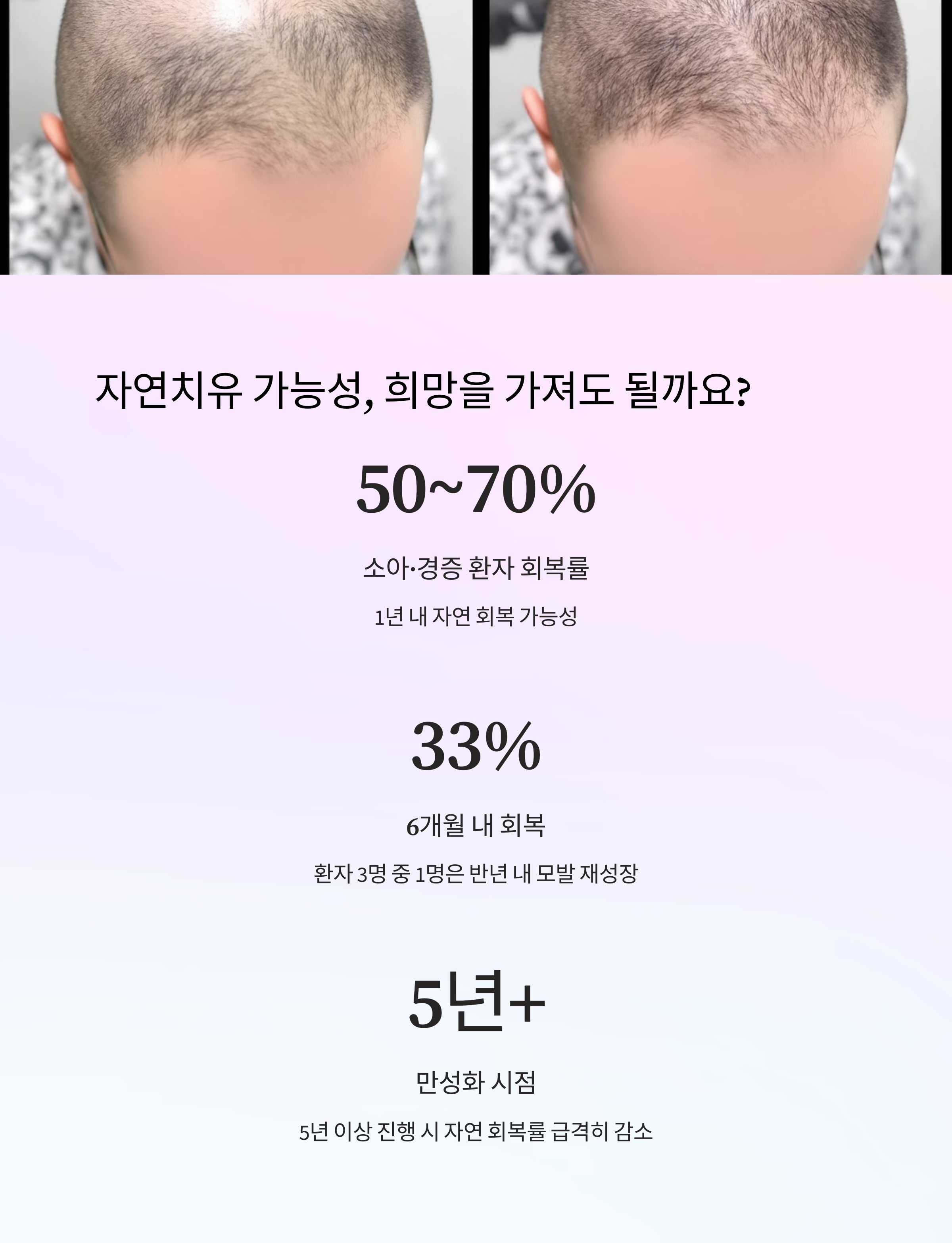놀랍게도 원형탈모는 별다른 치료 없이도 회복되는 경우가 있습니다.