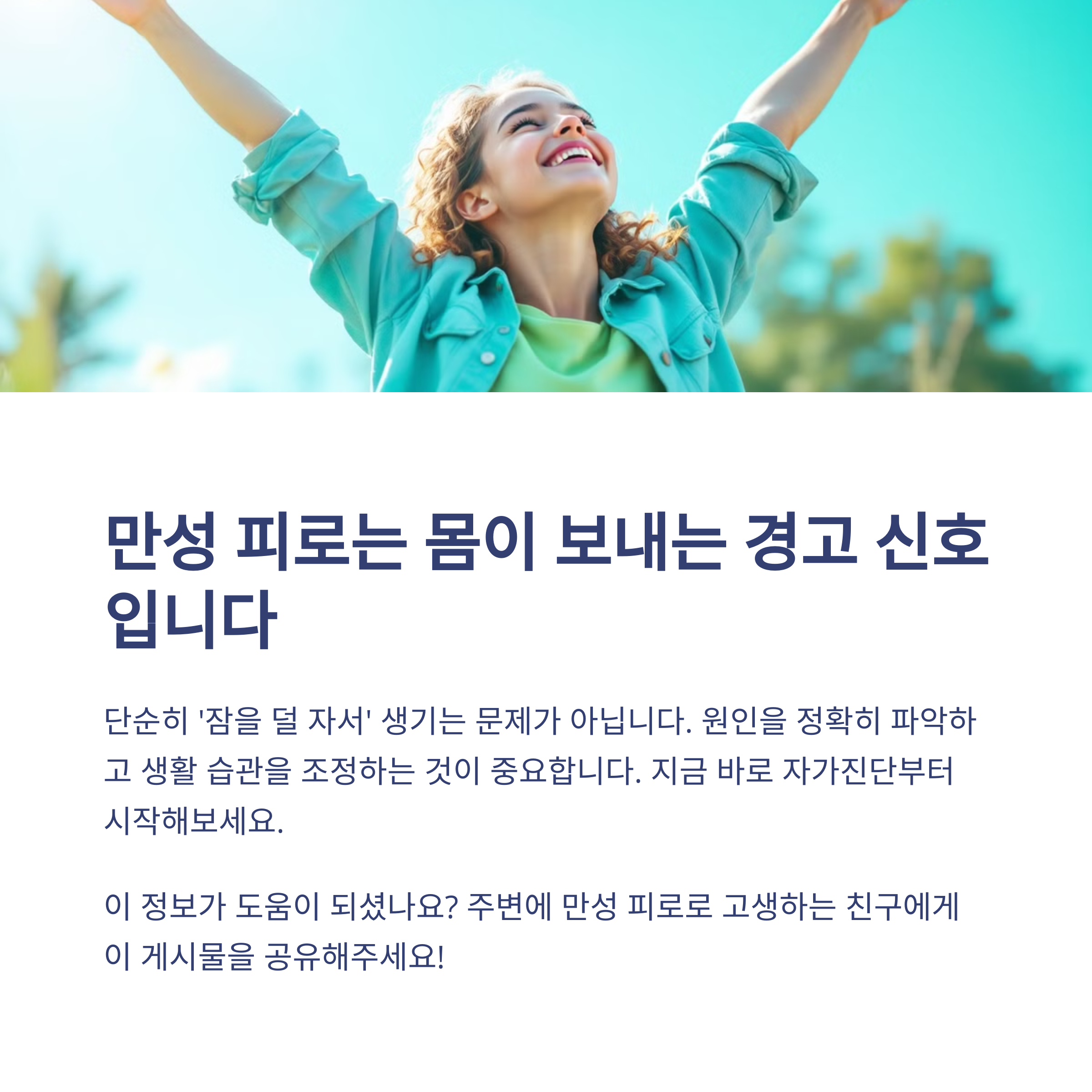 여러분의 몸이 보내는 피로 신호를 가볍게 여기지 말고, 수면 환경을 개선하고 스트레스를 줄이며 부족한 영양소를 채워나가는 노력이 필요합니다.