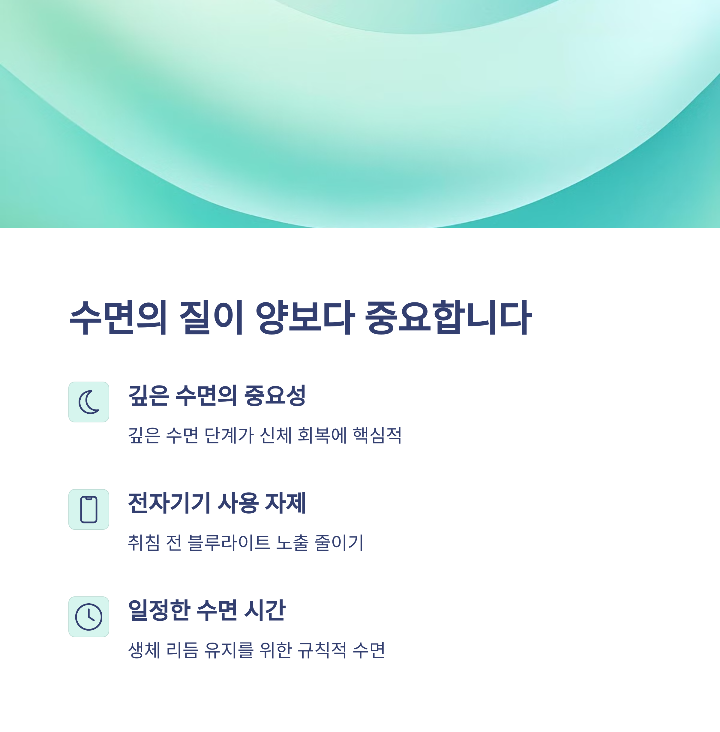 수면 단계 중 '깊은 수면'이 우리 몸의 회복을 돕기 때문에, 전자기기 사용 자제, 일정한 수면 시간 유지, 침실 환경 개선 등의 습관이 중요합니다.