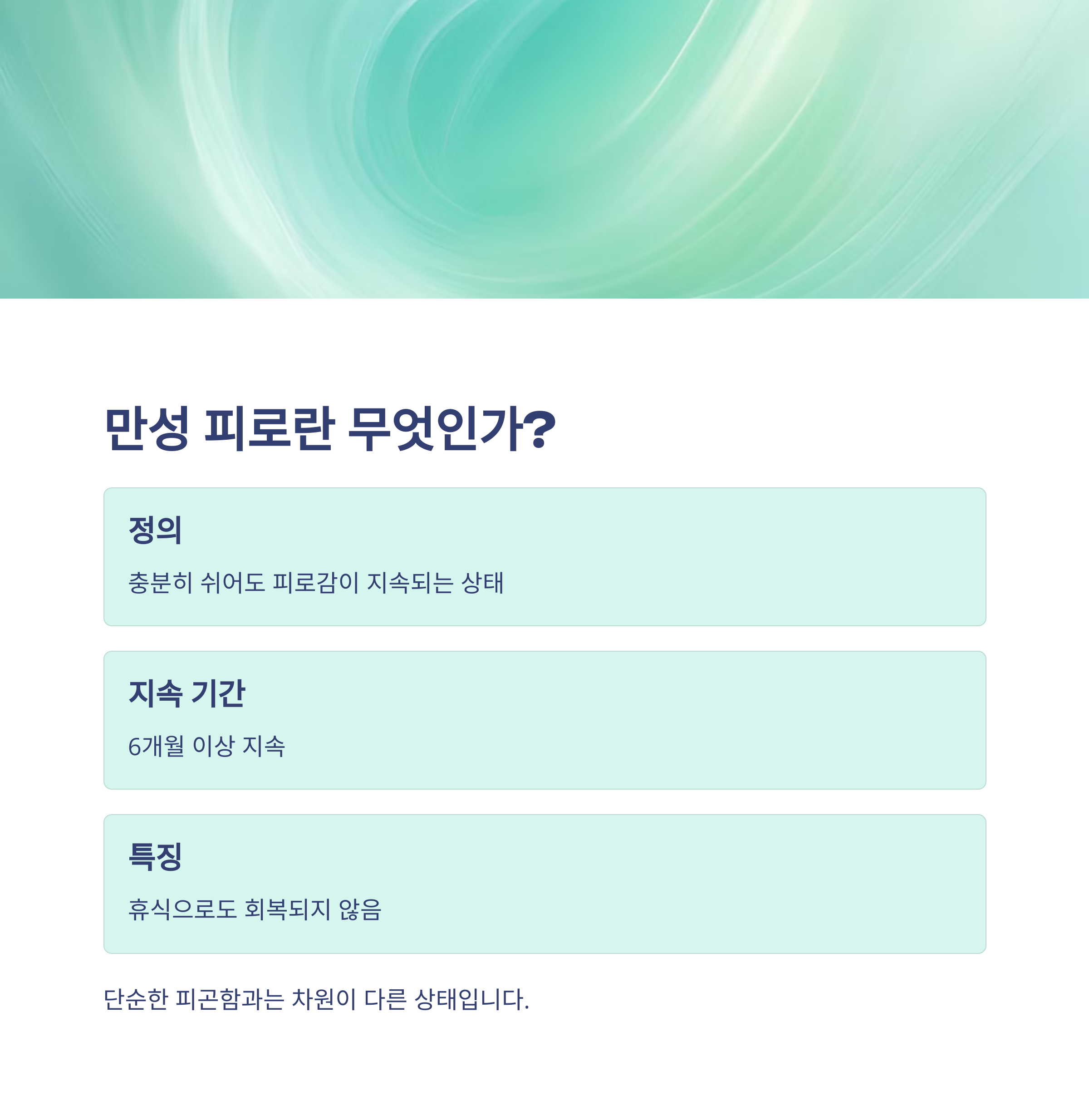 만성 피로란 단순한 피곤함과는 차원이 다릅니다. 충분히 쉬고 잠을 자도 피로감이 지속되며, 일상생활에 영향을 줄 정도로 에너지가 떨어진 상태를 말합니다.