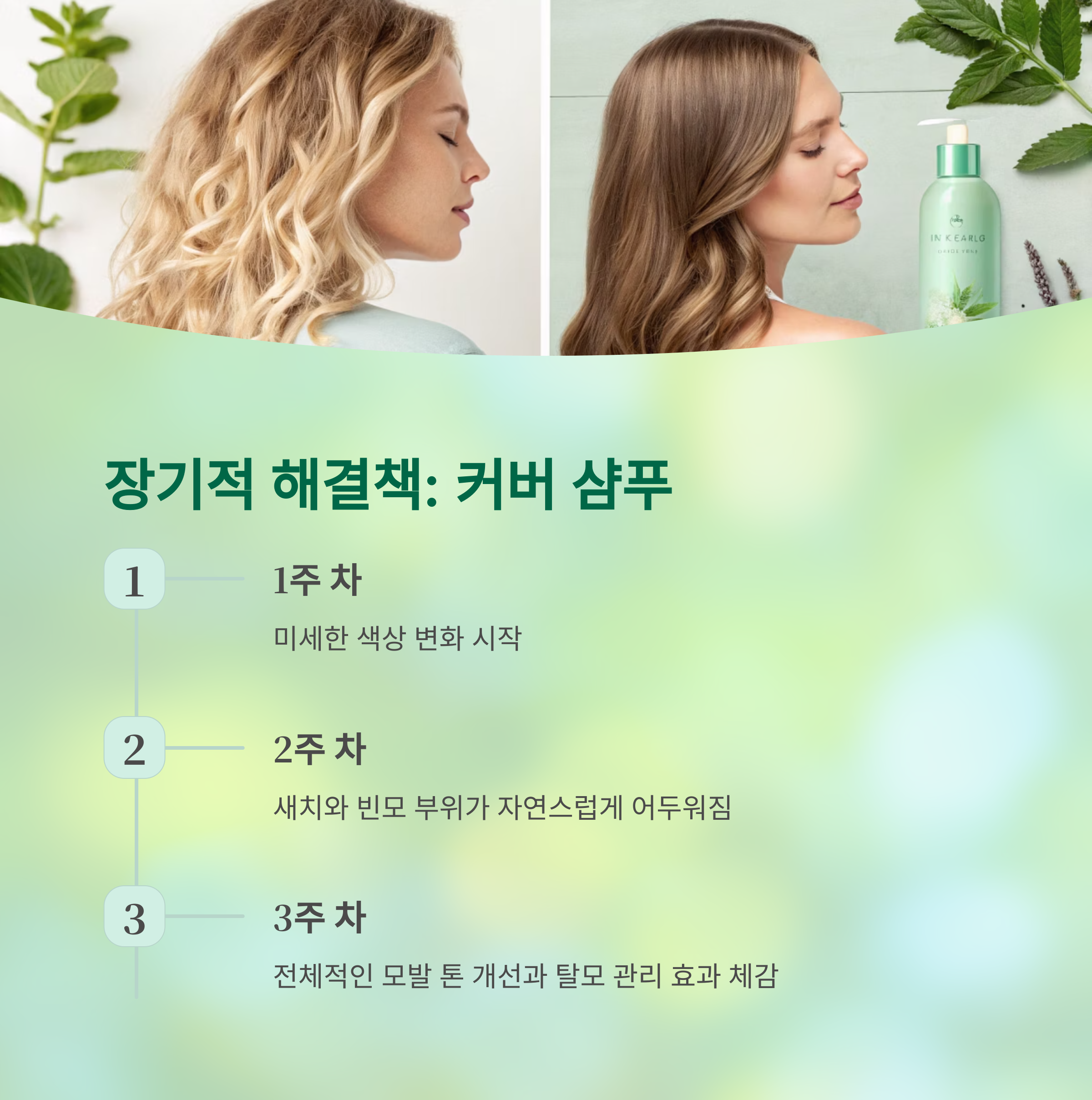 단기간 커버보다는 전체적인 톤 변화와 탈모 관리 효과를 동시에 원한다면 커버 샴푸/트리트먼트가 정답입니다. 사용 초반에는 큰 변화가 없어 보일 수 있지만, 2주 이상 사용하면 모발에 자연스러운 톤이 입혀지며 새치, 빈모 부위가 자연스럽게 어두워집니다.