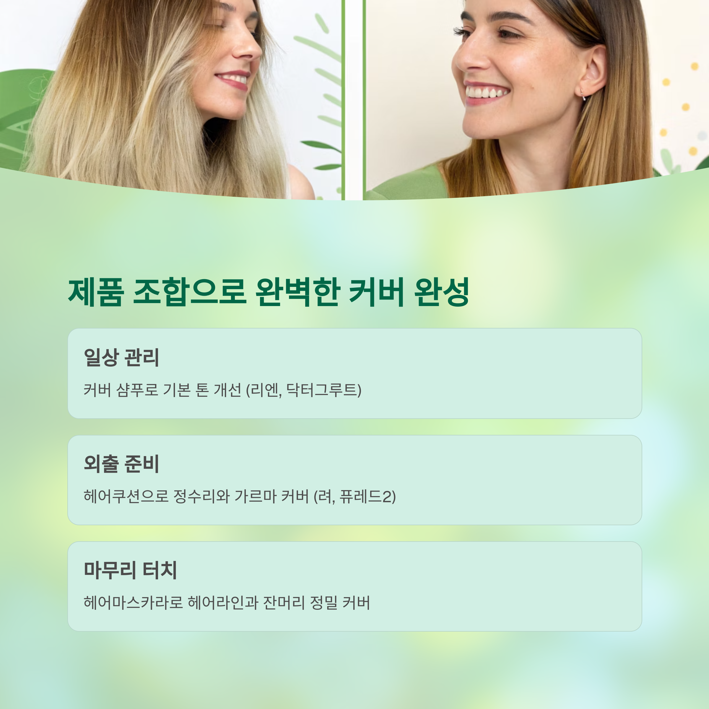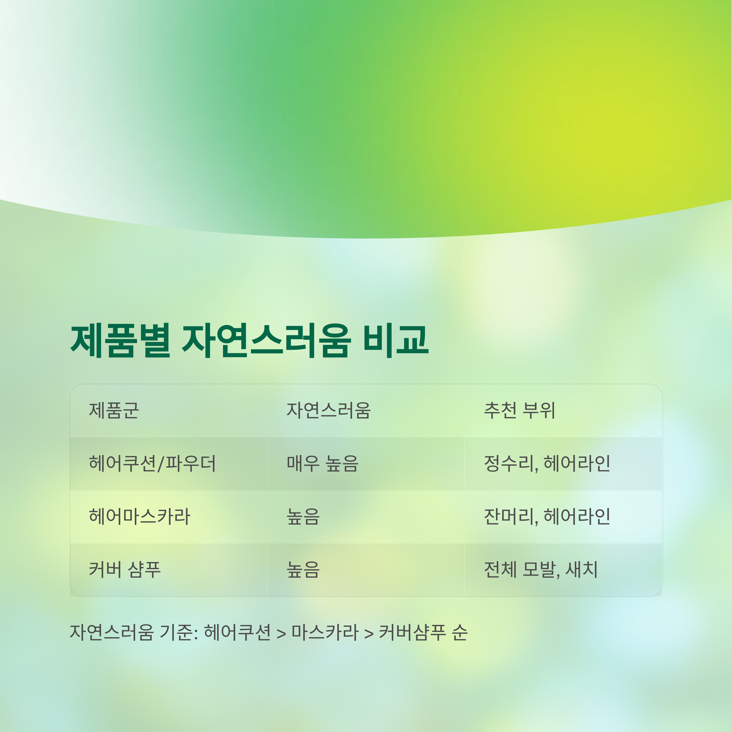 결론: 자연스러움 기준으로는 "헤어쿠션 > 마스카라 > 커버샴푸" 순입니다. 목적에 따라 병행 사용하면 시너지 효과를 볼 수 있습니다.