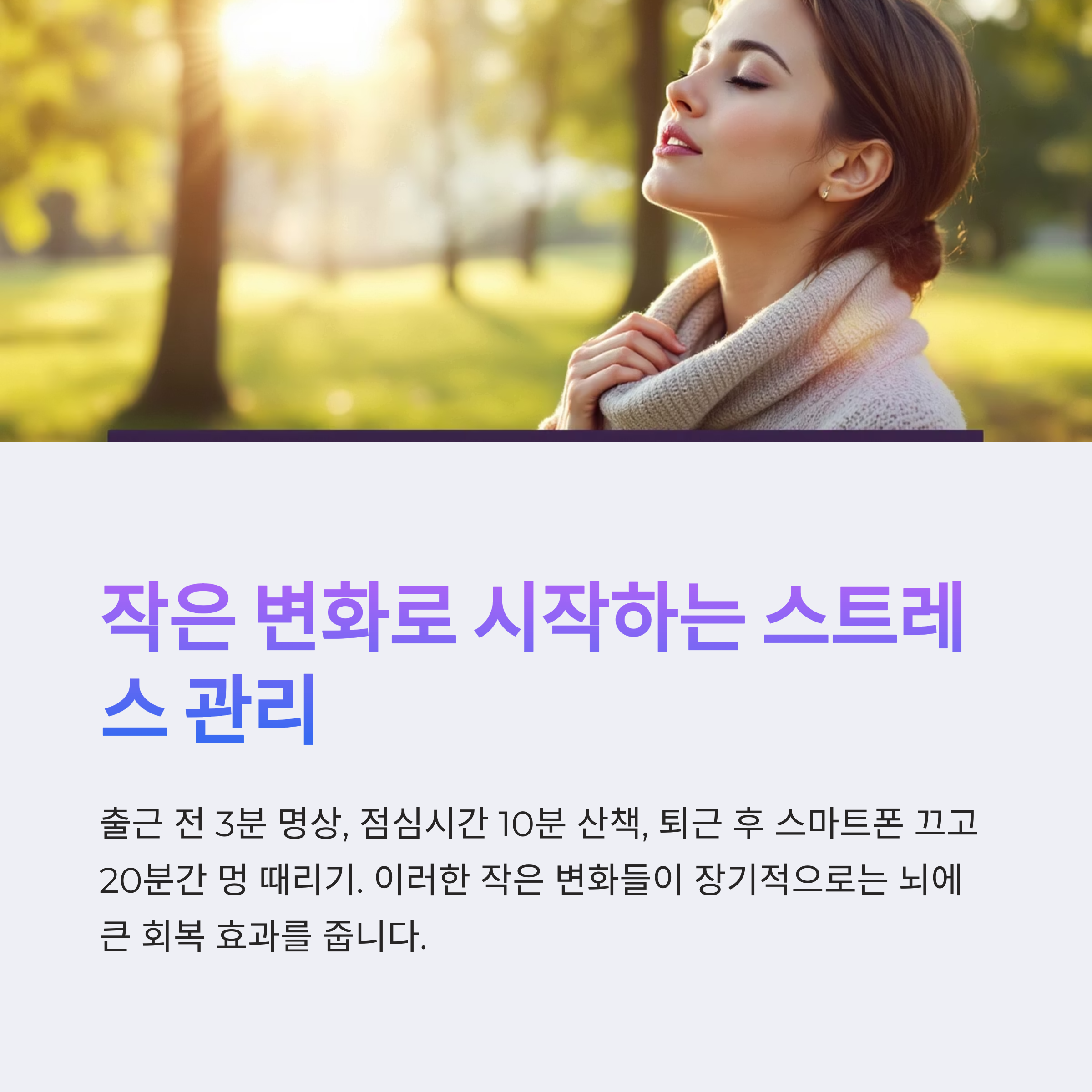 출근 전 3분 명상, 점심시간 10분 산책, 퇴근 후 스마트폰 끄고 20분간 멍 때리기.