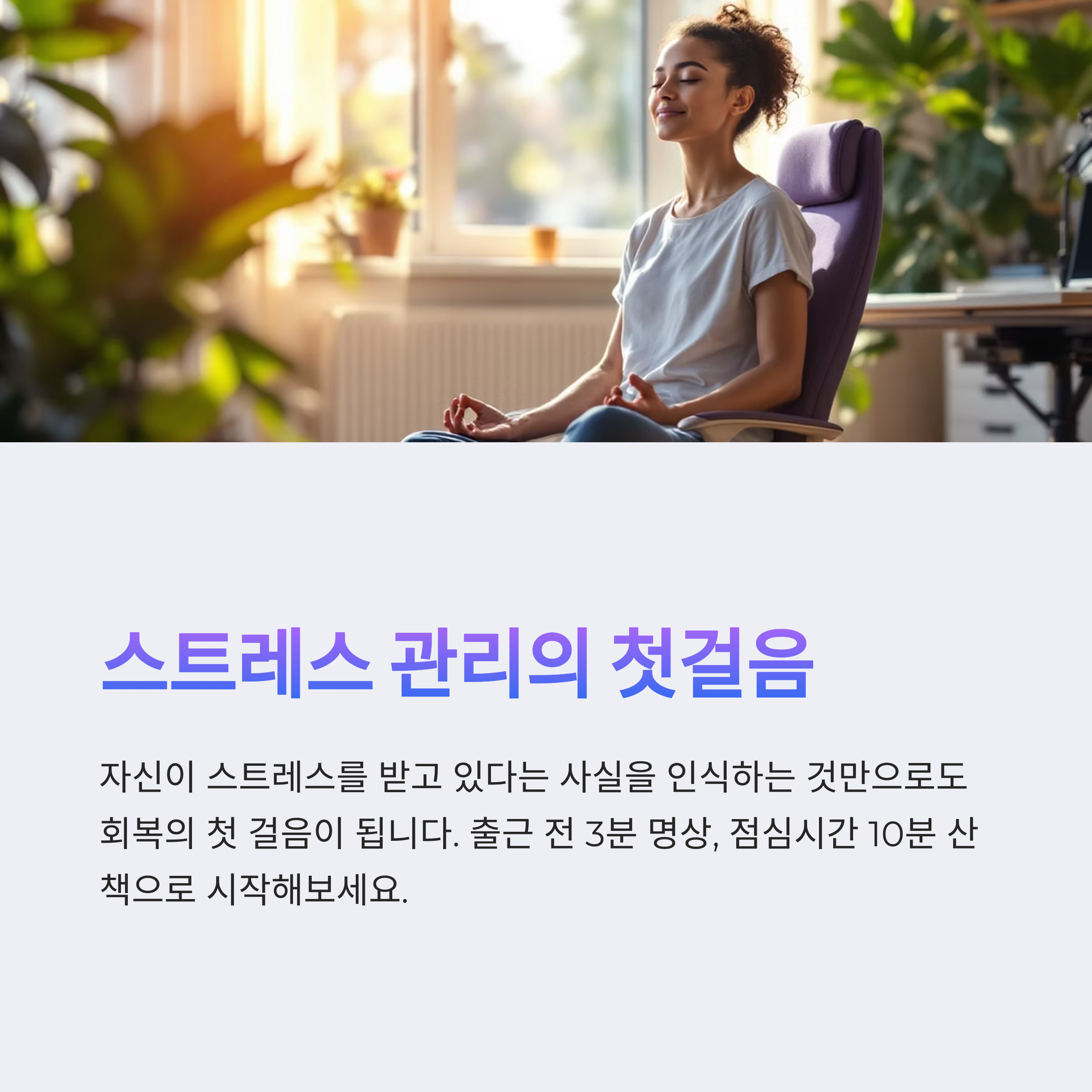 2025년, 직장인 10명 중 7명이 겪는 스트레스. 참는 것만이 해답일까요? 일상 속 실천 가능한 회복 방법을 함께 알아보세요.