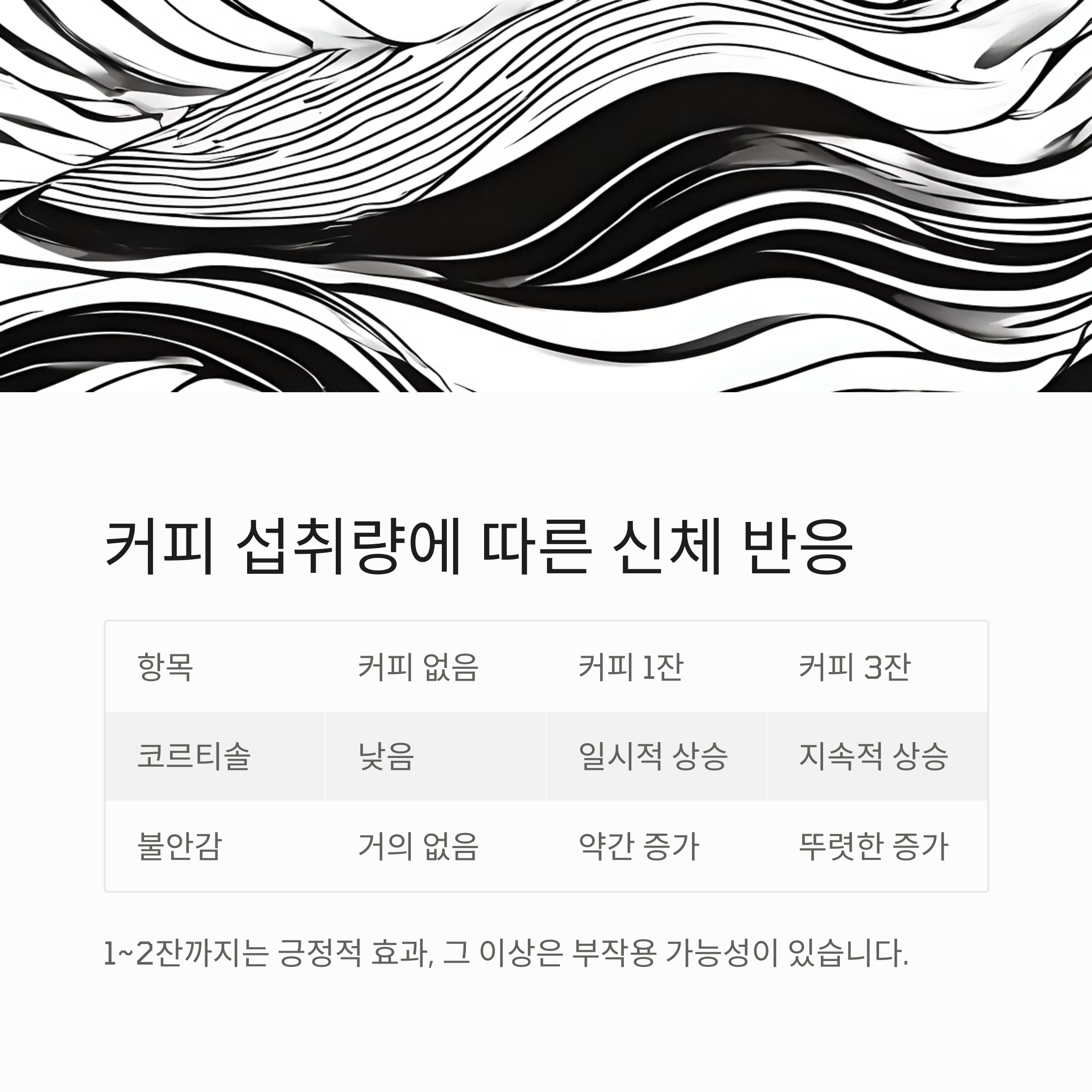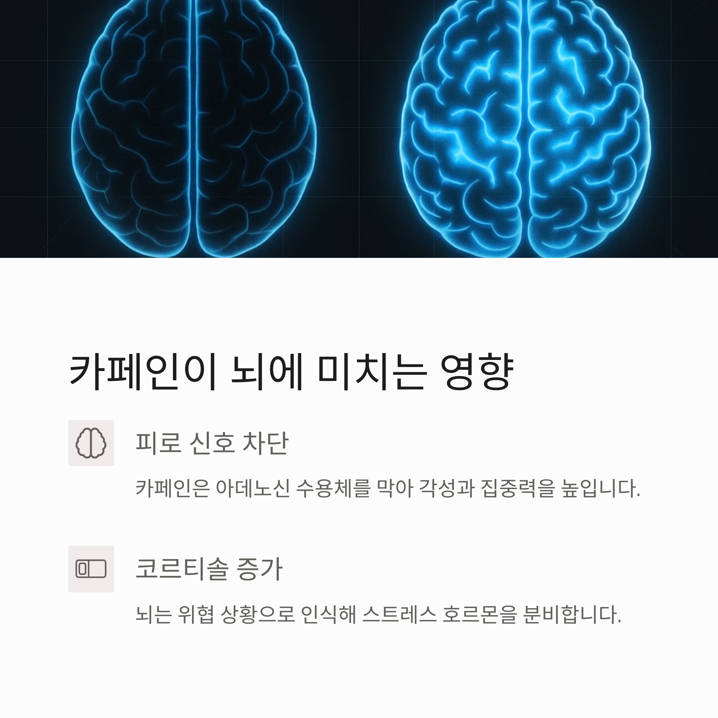각성과 집중력을 높입니다. 하지만 그 이면에는 스트레스 호르몬인 코르티솔 증가라는 작용이 숨어 있습니다.