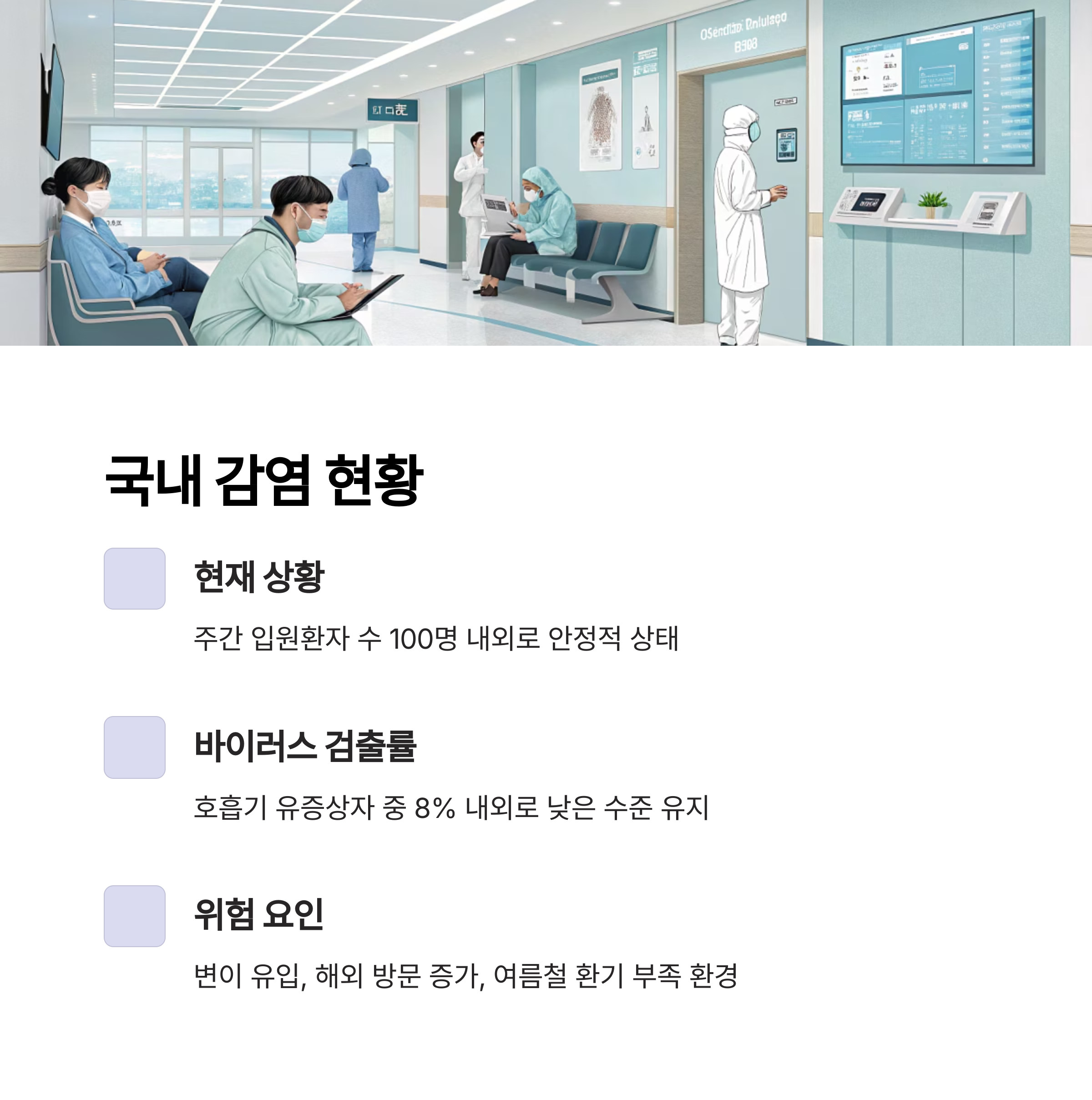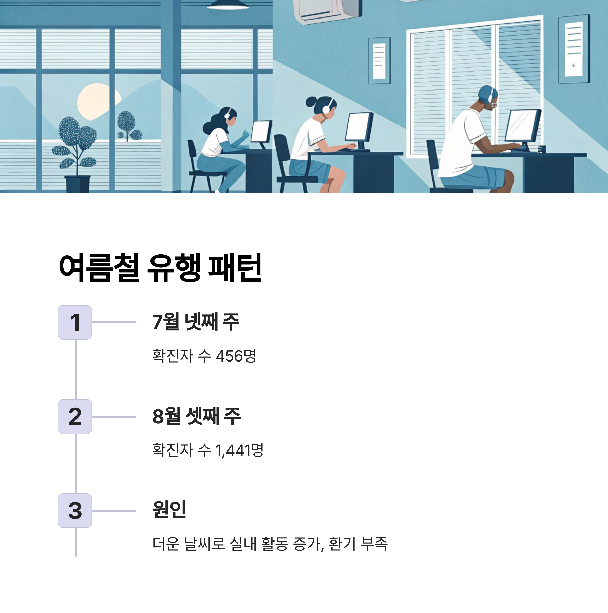 변이 유입과 해외 방문 증가, 여름철 환기 부족 환경 등을 주요 위험 요인으로 지목했습니다.