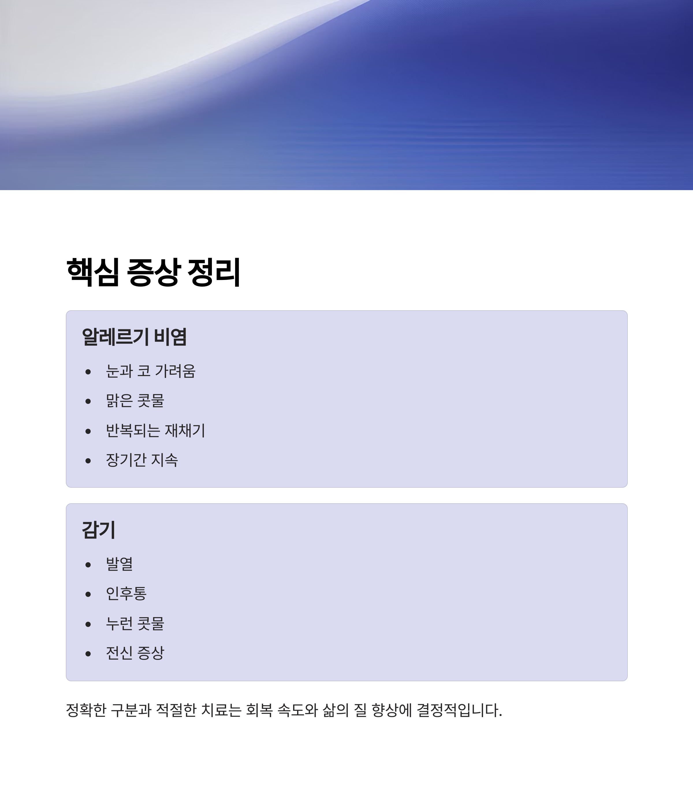 → 이 경우 감기보다는 알레르기 비염 가능성이 높습니다