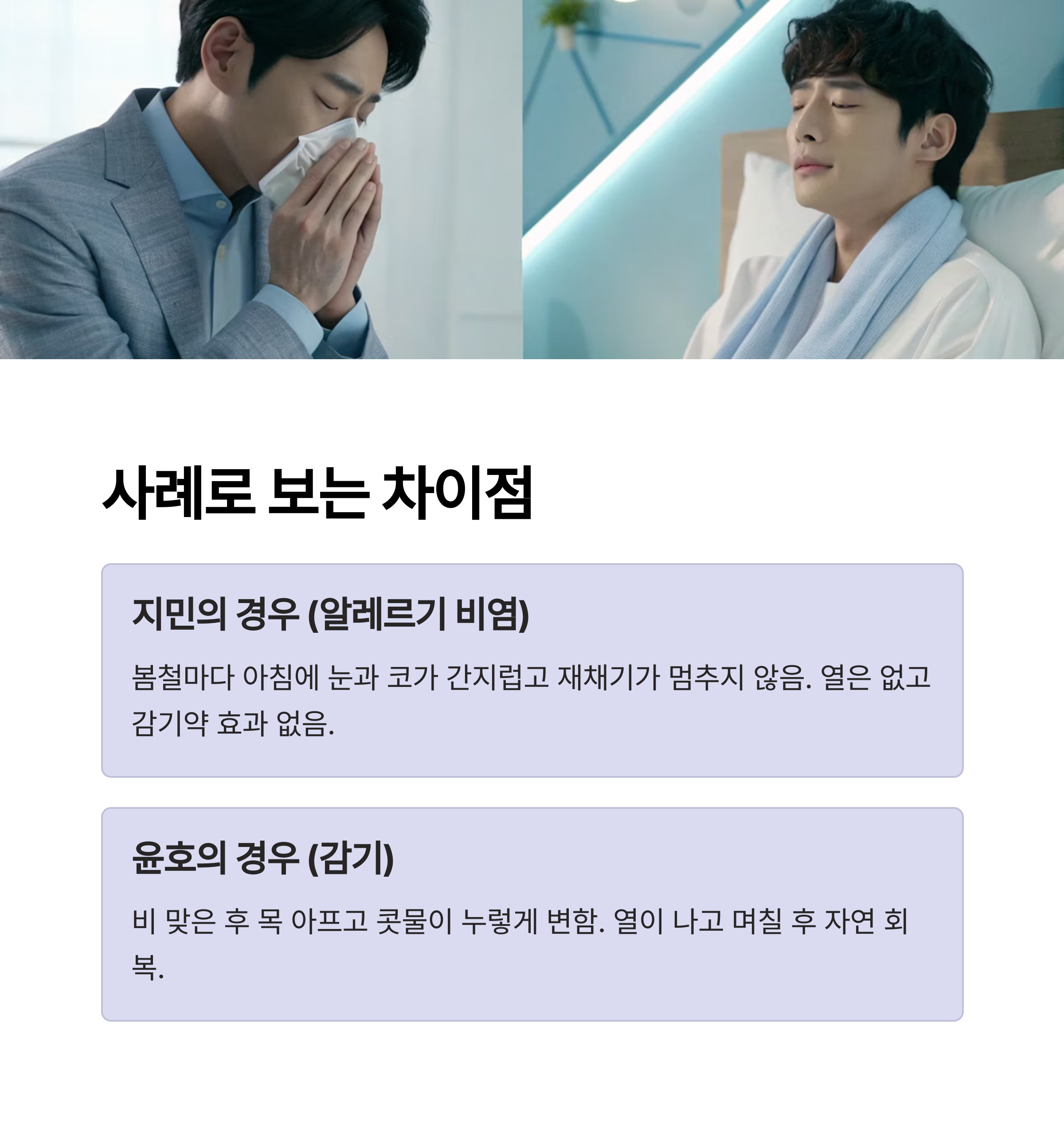 | 주요 증상 | 연속 재채기, 눈·코 가려움 | 인후통, 기침, 근육통 |