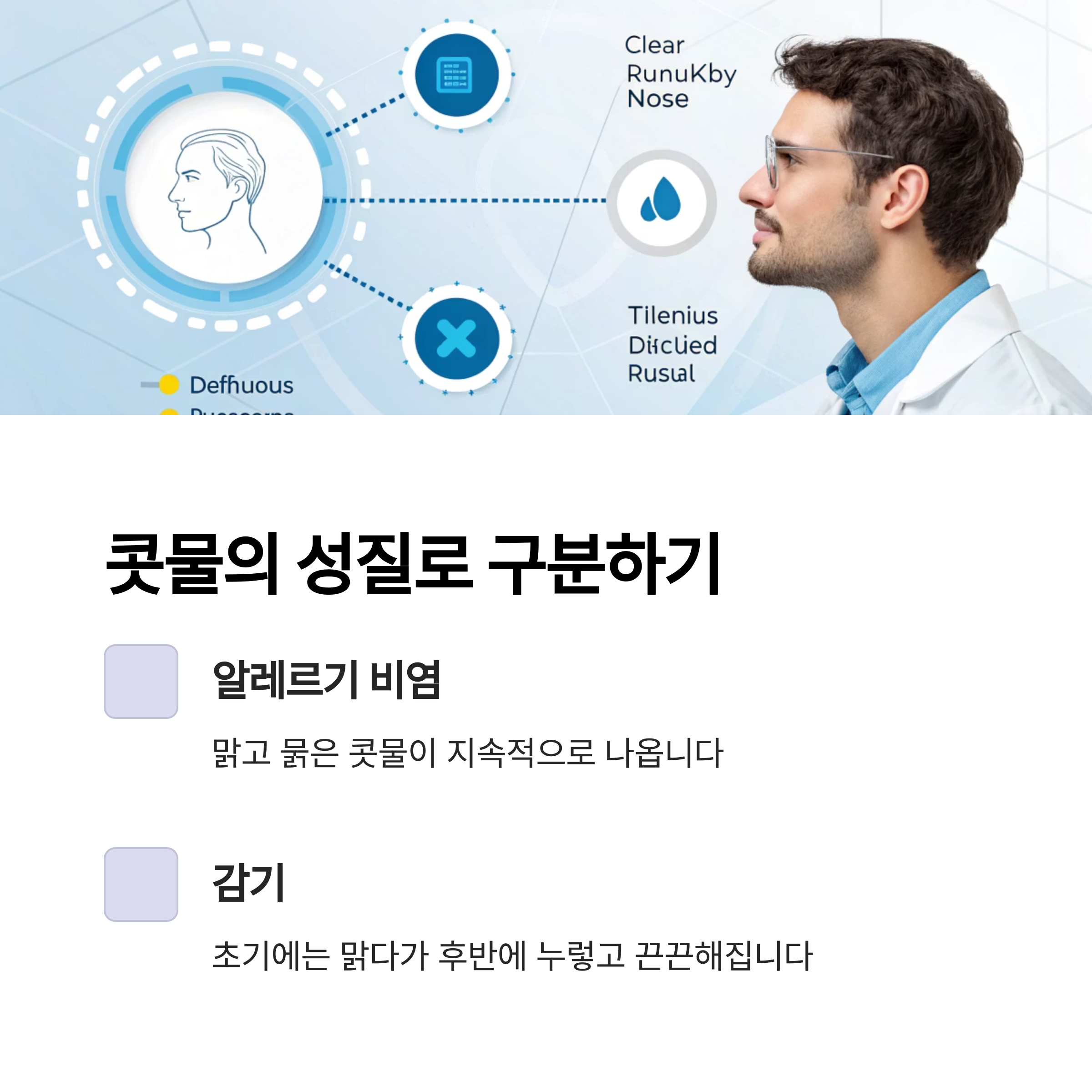 | 콧물 성질 | 맑고 묽음 | 초기 맑고, 후반 누렇고 끈끈함 |