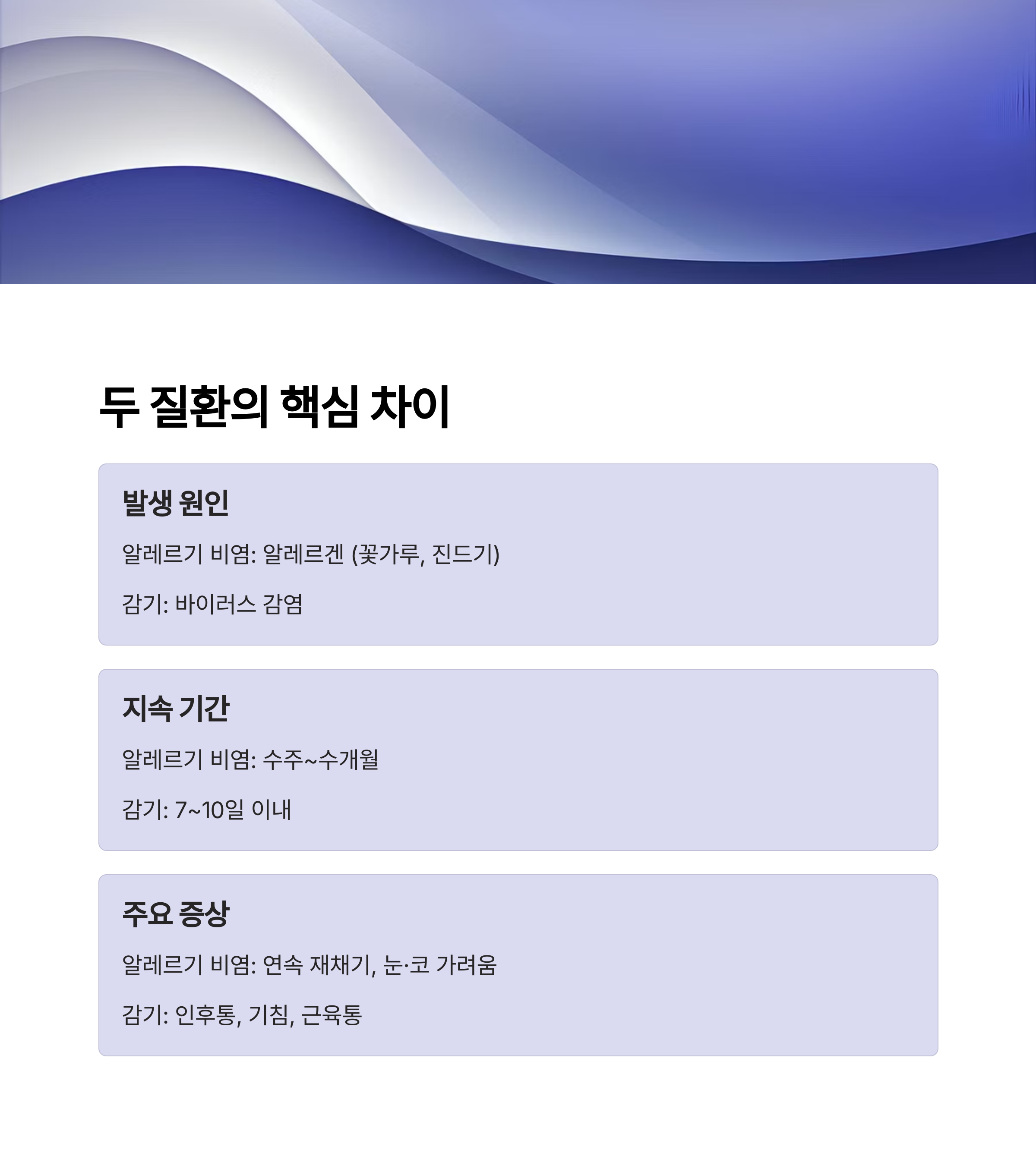 | 원인 | 알레르겐 (꽃가루, 진드기 등) | 바이러스 감염 |