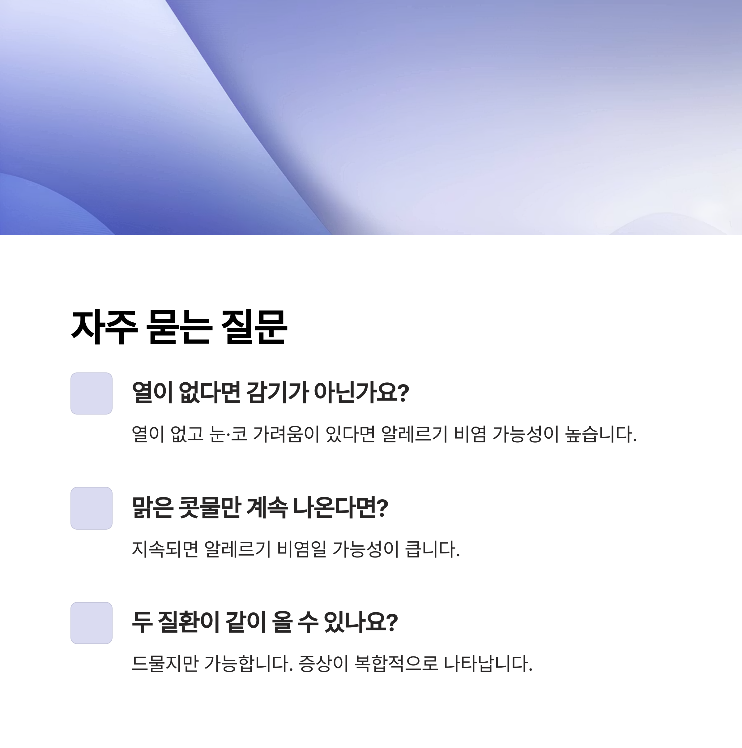 → 이 경우 감기보다는 알레르기 비염 가능성이 높습니다