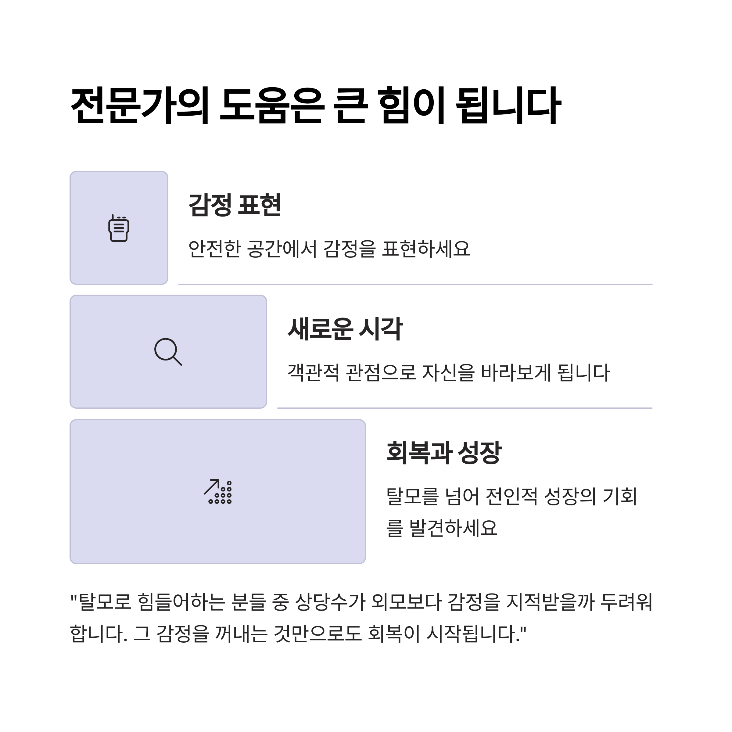 자존감을 회복하는 또 하나의 방법은 전문가의 도움을 받는 것입니다. 심리 상담은 단순한 대화가 아니라, 내 감정의 흐름을 정리하고 새로운 시각을 갖게 하는 데 매우 유익합니다. 상담을 통해 우리는 탈모라는 외적인 변화가 아닌, 내면의 문제에 집중할 수 있게 됩니다. 이 과정을 통해 진정한 의미의 자존감을 다시 찾을 수 있습니다.