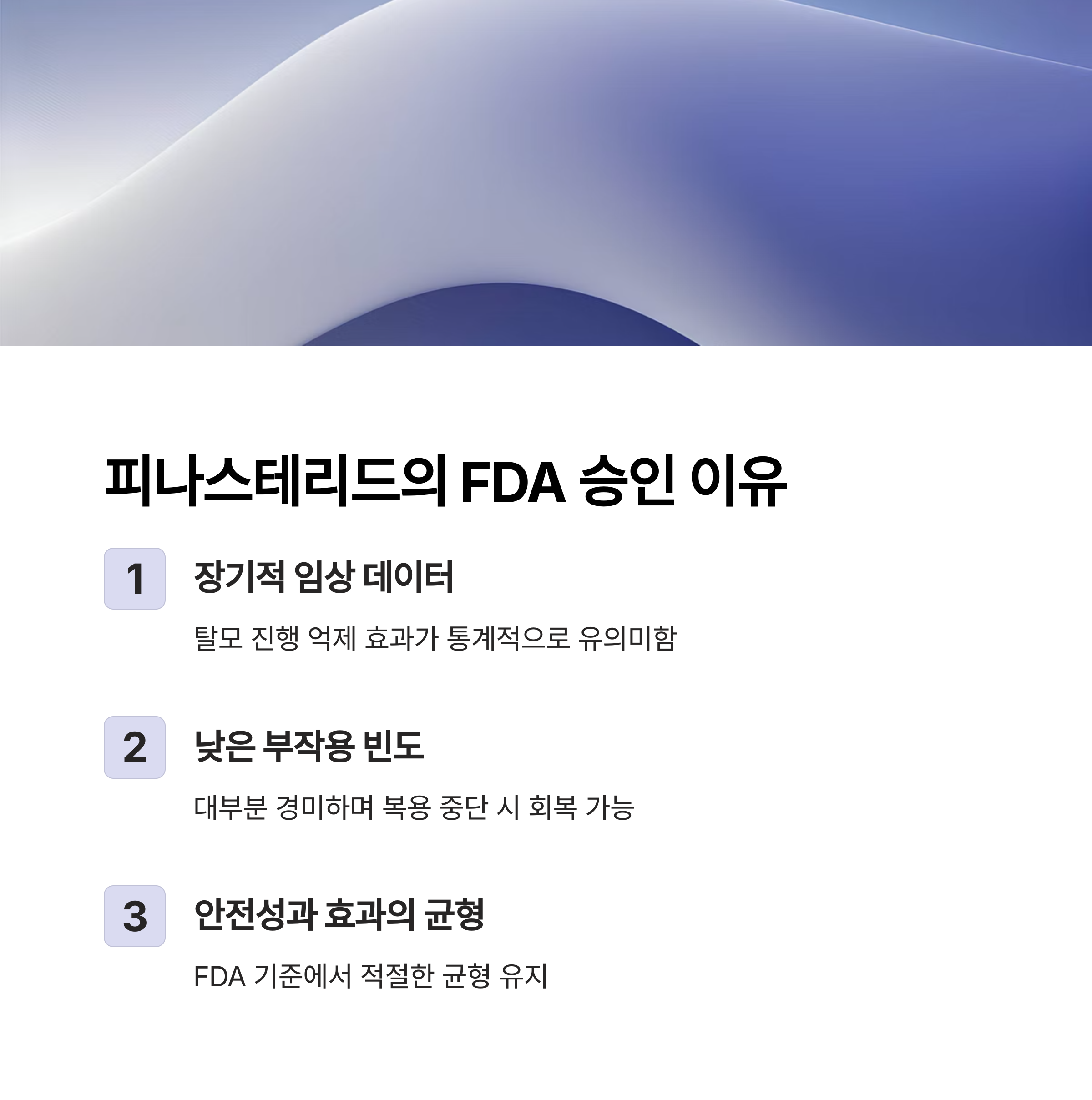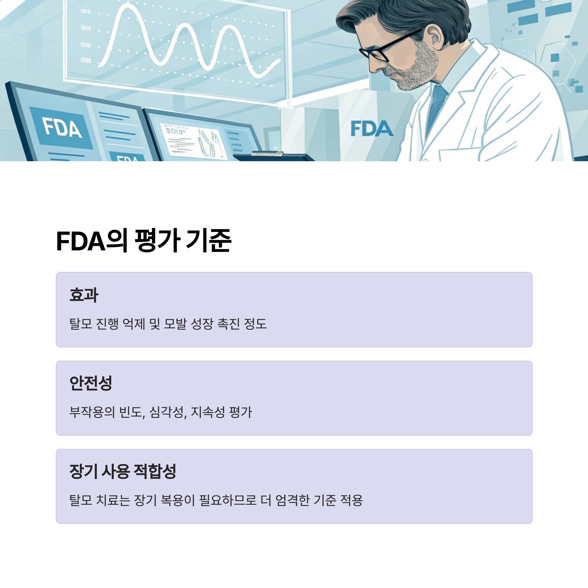 셋째, 탈모 치료제는 장기 복용이 일반적이므로, FDA는 효과 대비 부작용 리스크를 더 엄격하게 평가합니다.
