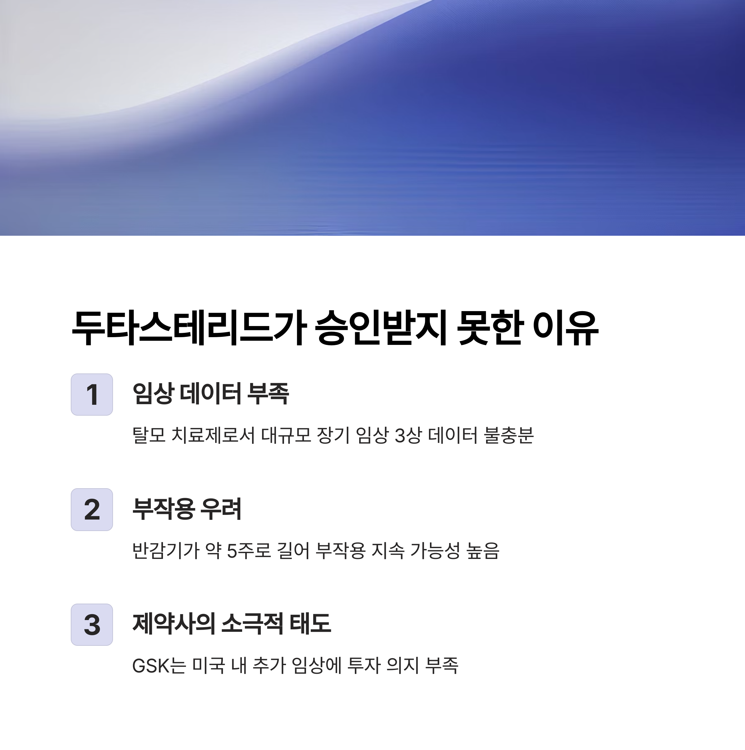 둘째, 부작용 우려가 피나스테리드보다 컸습니다. 특히 반감기가 약 5주로 매우 길어 부작용이 지속될 가능성이 더 크다는 지적이 있었습니다.