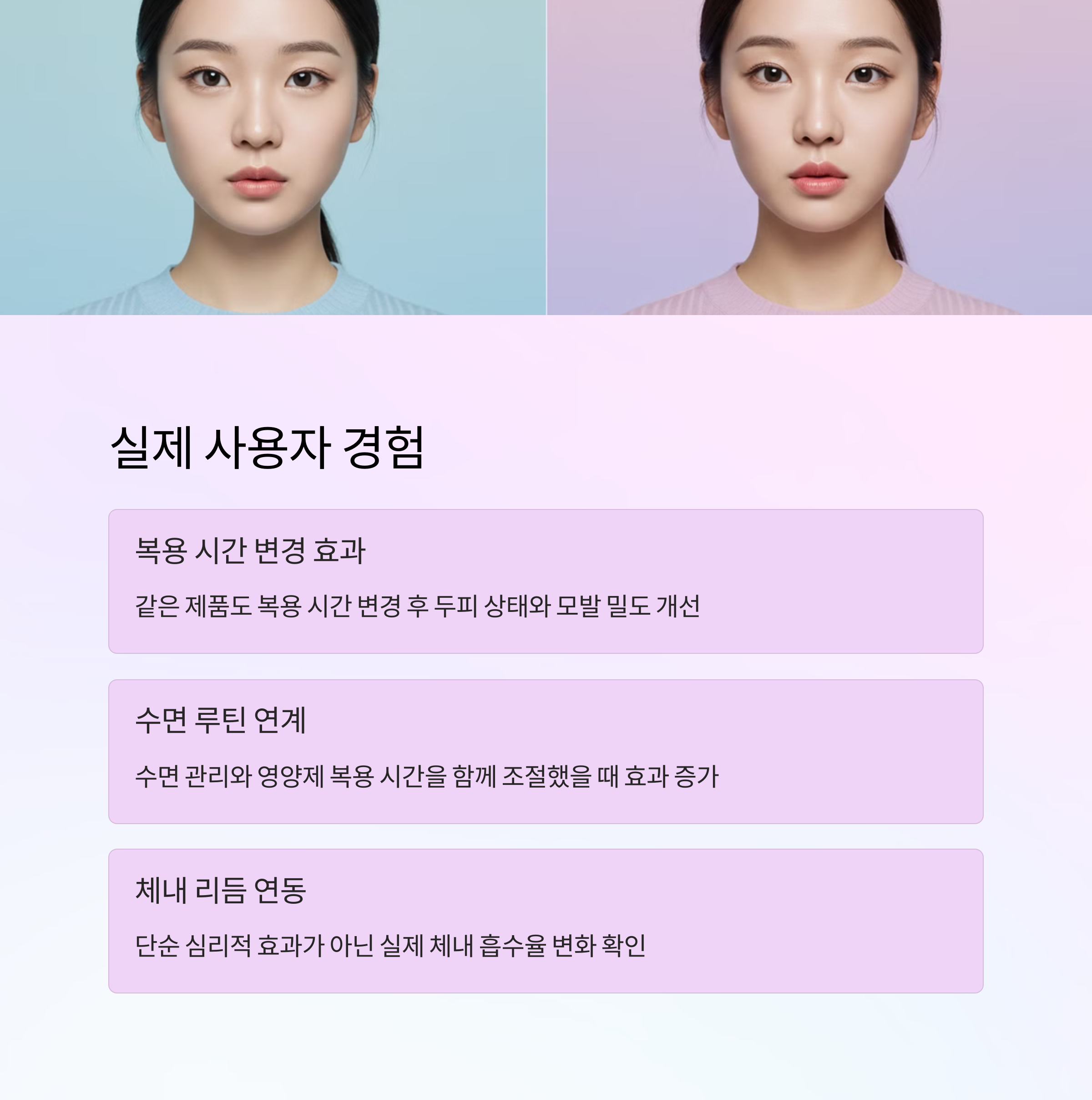 실제 사용자들의 후기를 보면, 같은 제품이라도 복용 시간을 바꾼 후 두피 상태나 모발 밀도에서 차이를 느꼈다는 평가가 많습니다. 특히 수면 루틴과 영양제 복용을 함께 관리했을 때 그 차이가 더 두드러졌다고 합니다. 이는 단순한 심리적 효과가 아니라, 체내 리듬과 영양소 흡수율이 실제로 연동된다는 것을 보여주는 좋은 사례입니다.