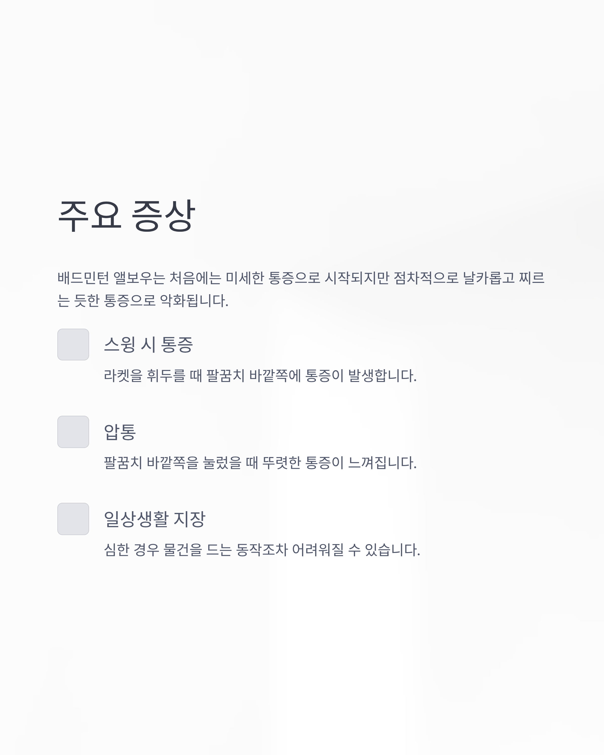 심한 경우 물건을 드는 동작조차 어려워질 수 있습니다.