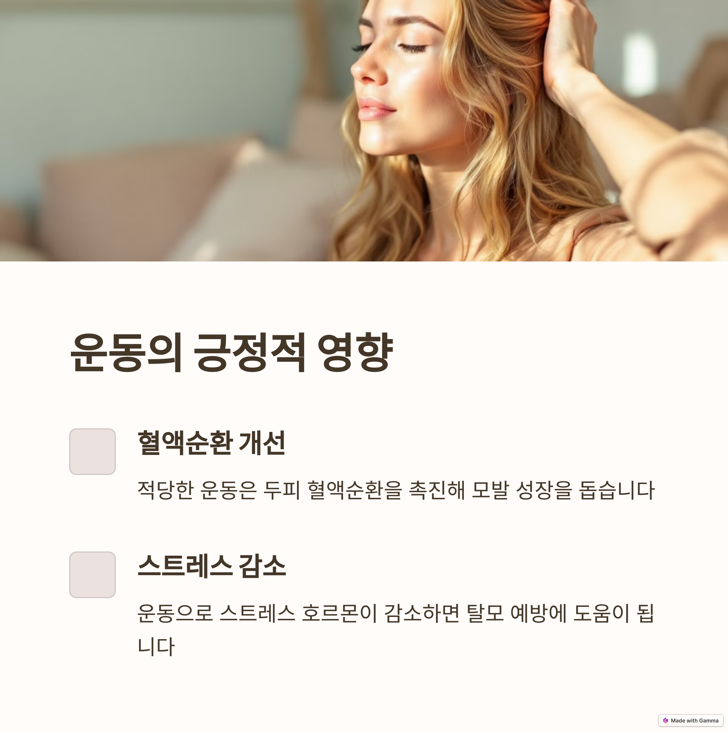 | 유산소 운동은 탈모 예방에 도움됩니다. | 과도한 호르몬 변화는 관리 필요 | 청결 유지와 혈류 개선이 중요합니다. |