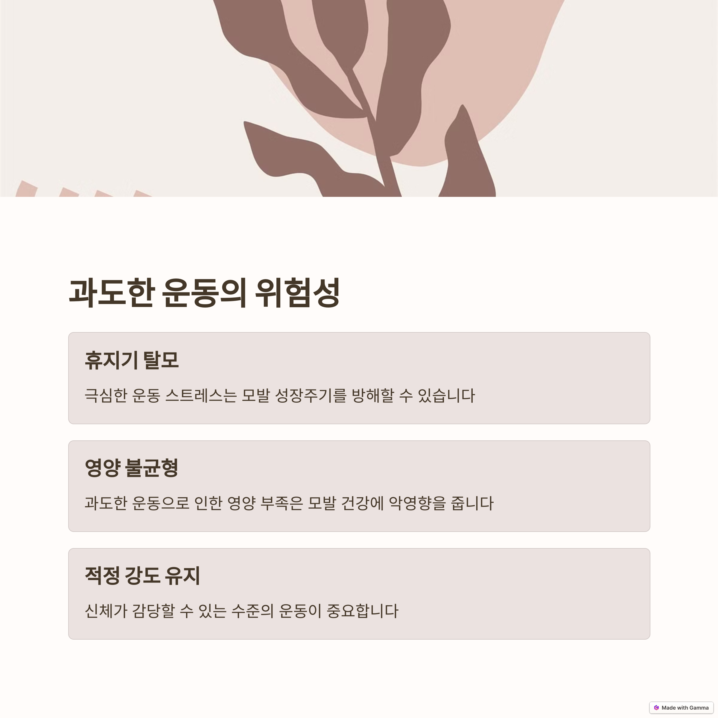 운동은 건강을 위한 필수 활동이지만, 그 방식과 강도에 따라 모발에도 영향을 줄 수 있습니다. 특히 유전적 요인이 있거나 DHT 수치가 예민한 분들은 웨이트 트레이닝 후 탈모 증상을 경험할 수 있기 때문에 자신의 몸 상태와 체질에 맞는 운동 계획을 세우는 것이 중요합니다. 동시에 탈모를 예방하기 위한 두피 관리 습관도 꾸준히 병행해야 하며, 유산소 운동을 통해 혈류 개선, 스트레스 완화 등의 효과도 놓치지 않아야 합니다. 무엇보다도 자신의 몸의 신호에 귀 기울이고 전문가의 조언을 적절히 참고하여 건강한 루틴을 만드는 것이 가장 현명한 방법입니다.