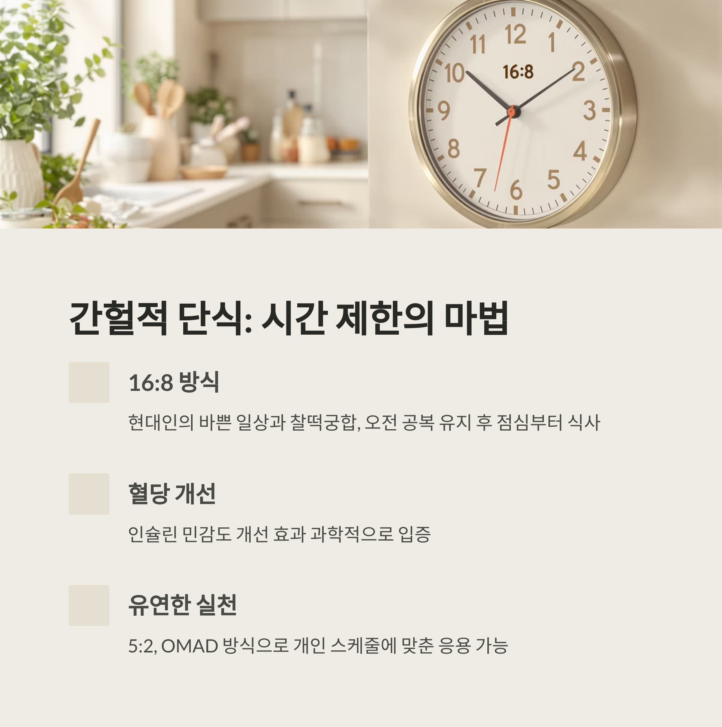 "가장 대중적인 16:8 방식은 현대인의 바쁜 일상과 찰떡궁합입니다."
