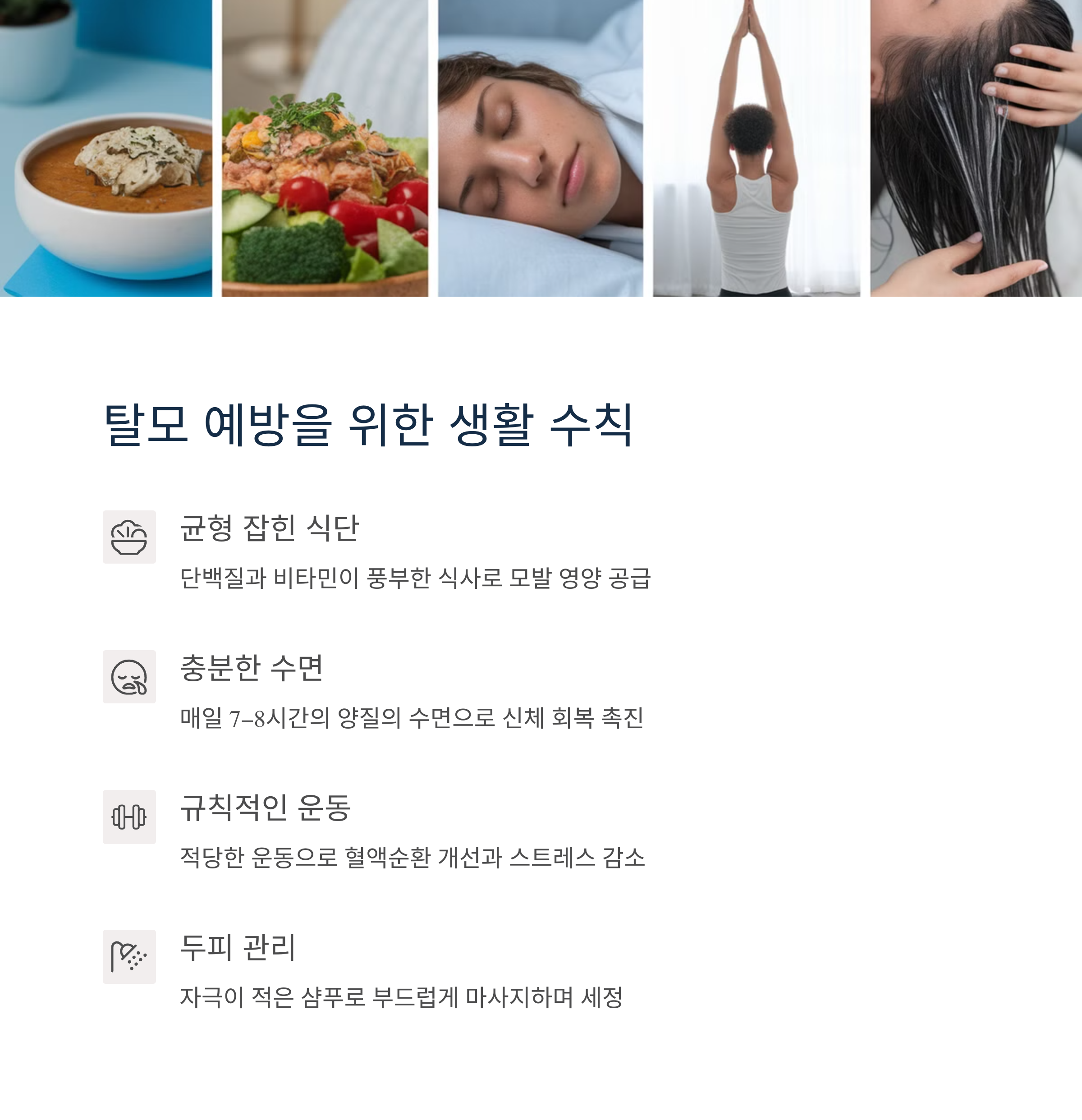 탈모 예방을 위한 실천 방법으로는 하루 7시간 이상의 수면, 스트레스 완화, 고단백 저지방 식단, 철분·아연·비오틴 등의 꾸준한 섭취가 중요합니다. 또한 두피 전용 샴푸를 사용하고 마사지로 혈행을 촉진하는 것도 도움이 됩니다. 헤어 젤, 염색, 잦은 열기구 사용 등 스타일링 습관도 점검해야 할 부분입니다. 탈모는 미리 관리하면 진행을 늦추거나 예방이 가능하므로 지금부터라도 생활 전반을 돌아보는 노력이 필요합니다.